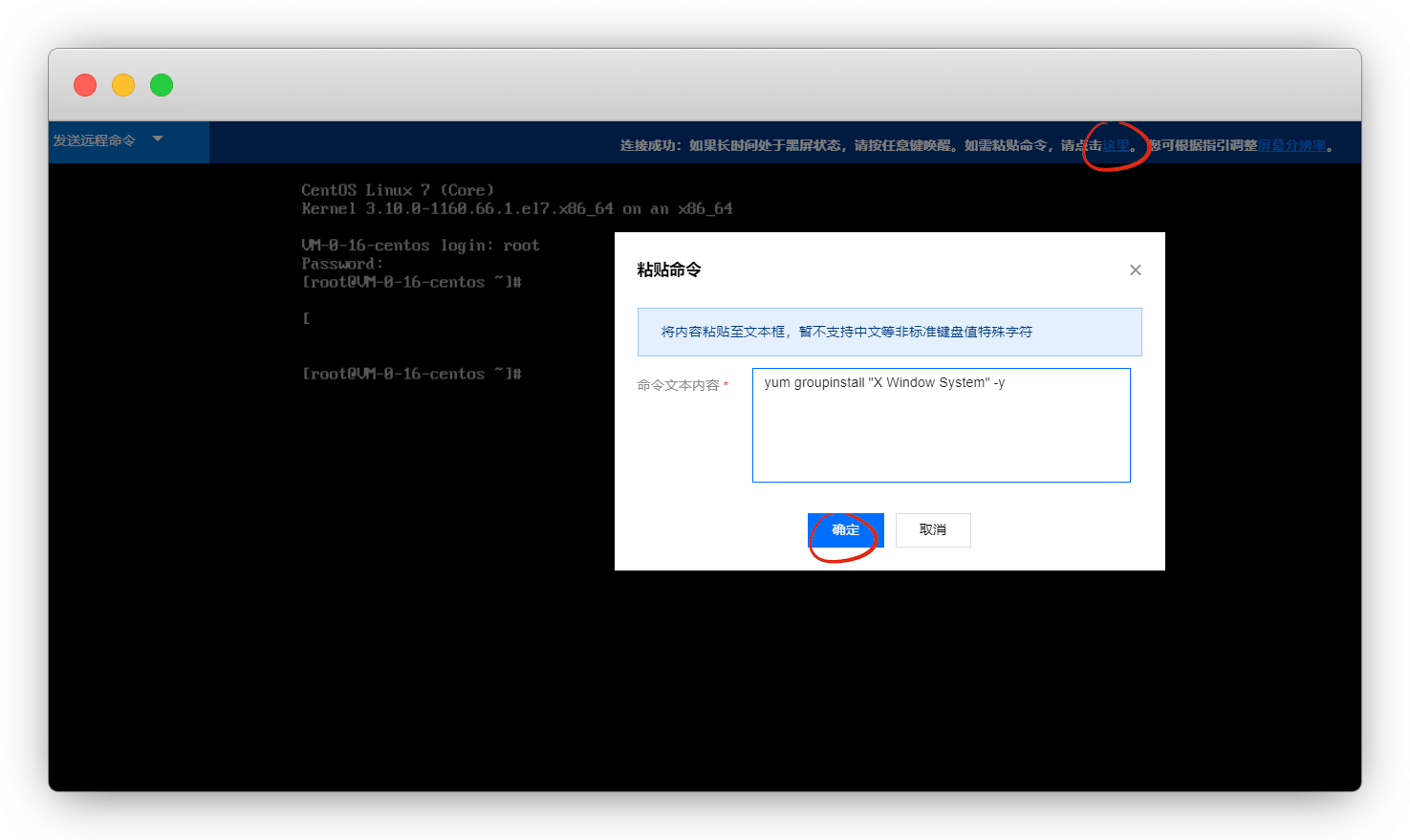 yum groupinstall "X Window System" -y因为VNC登录不能粘贴,我们点击上面,在输入框里输入,确定,回车,直到安装完成