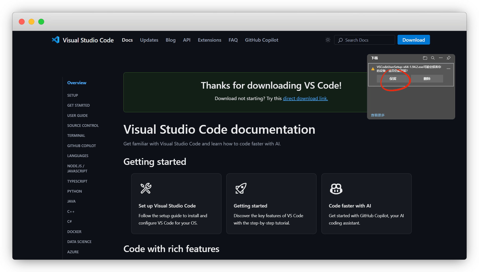 点击 Download for Windows 下载即可,Edge浏览器下载的需要点一下保留
