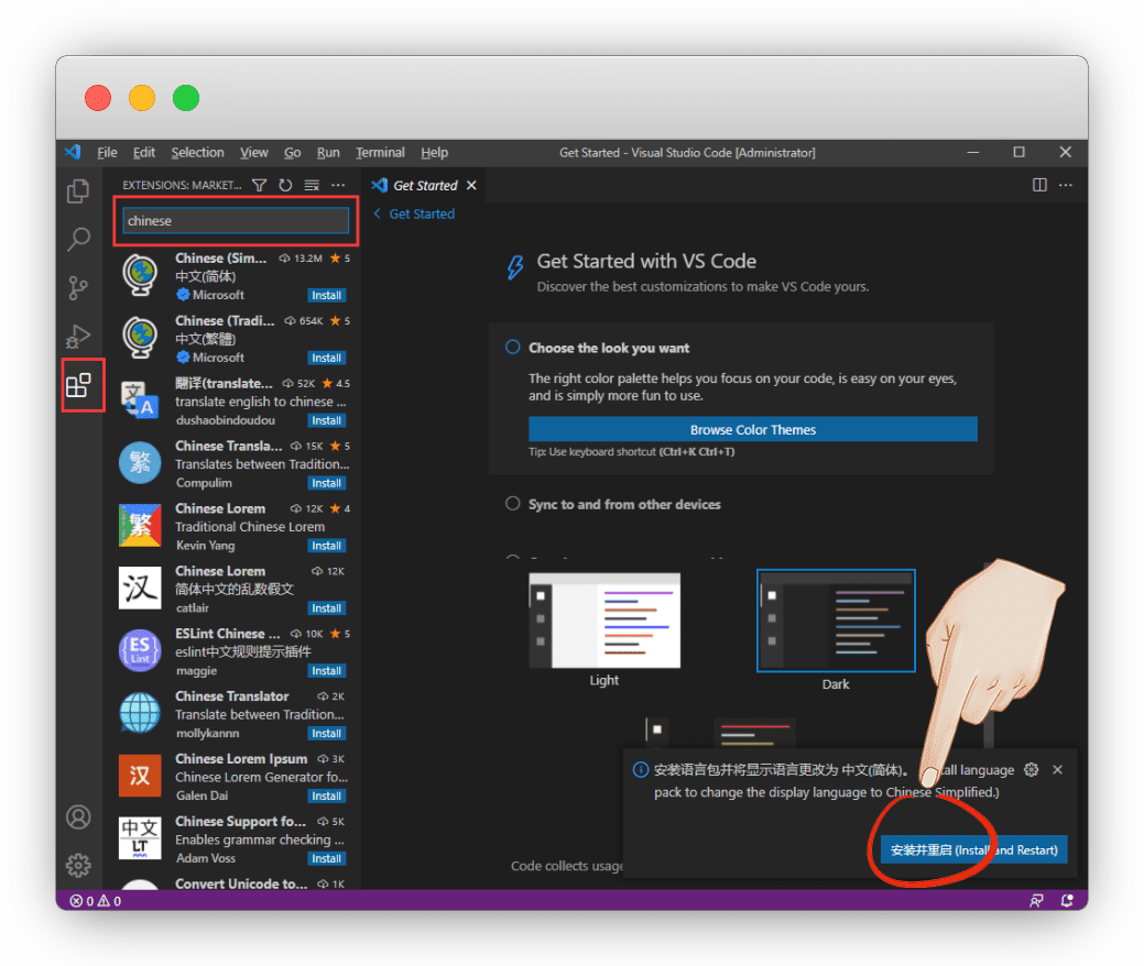 左侧扩展栏,搜索框搜 Chinese ,点击 Install 安装简体中文