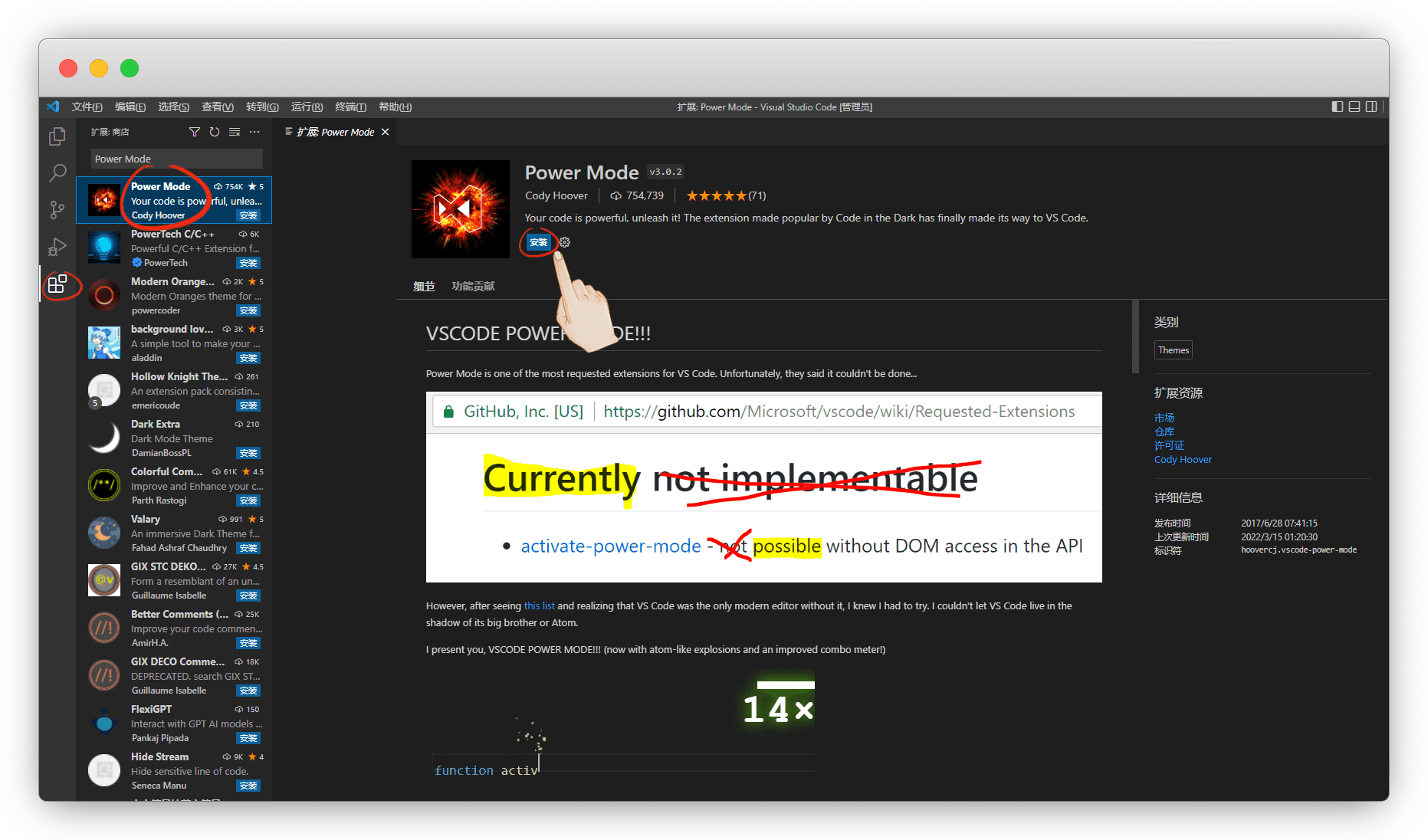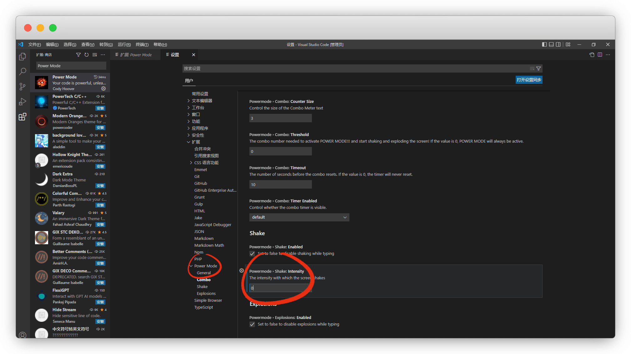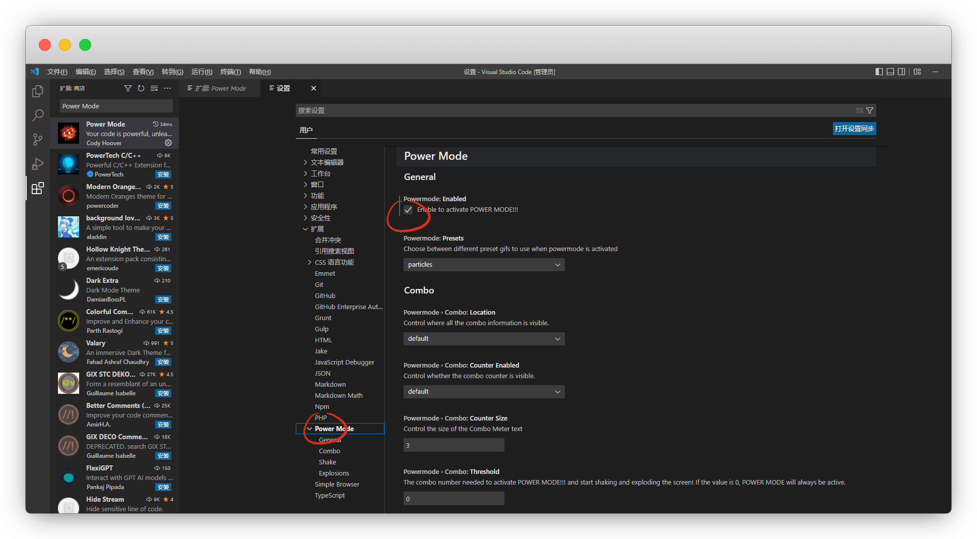 文件 - 首选项 - 设置 - 扩展 - Power Mode,勾选 Powermode:Enabled