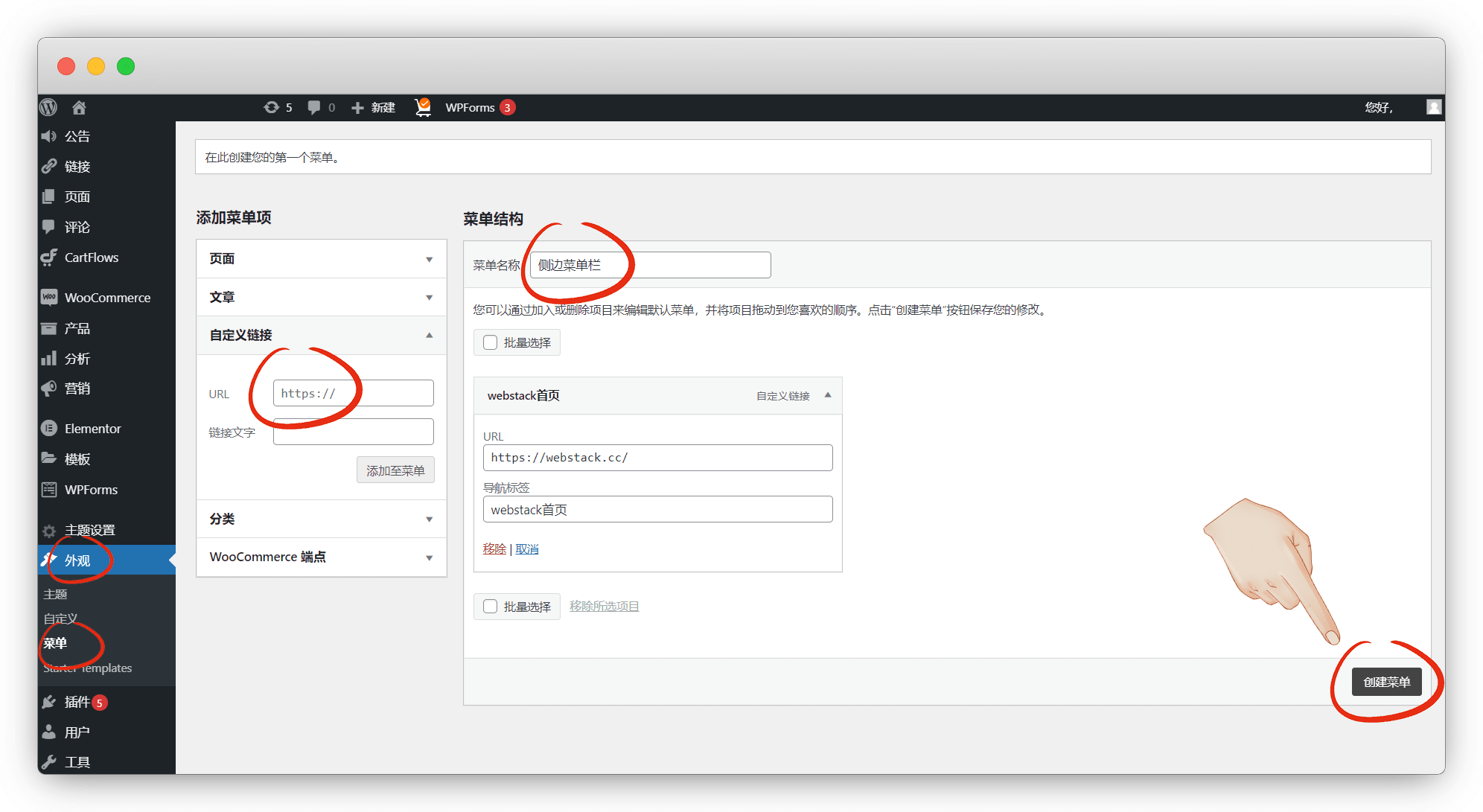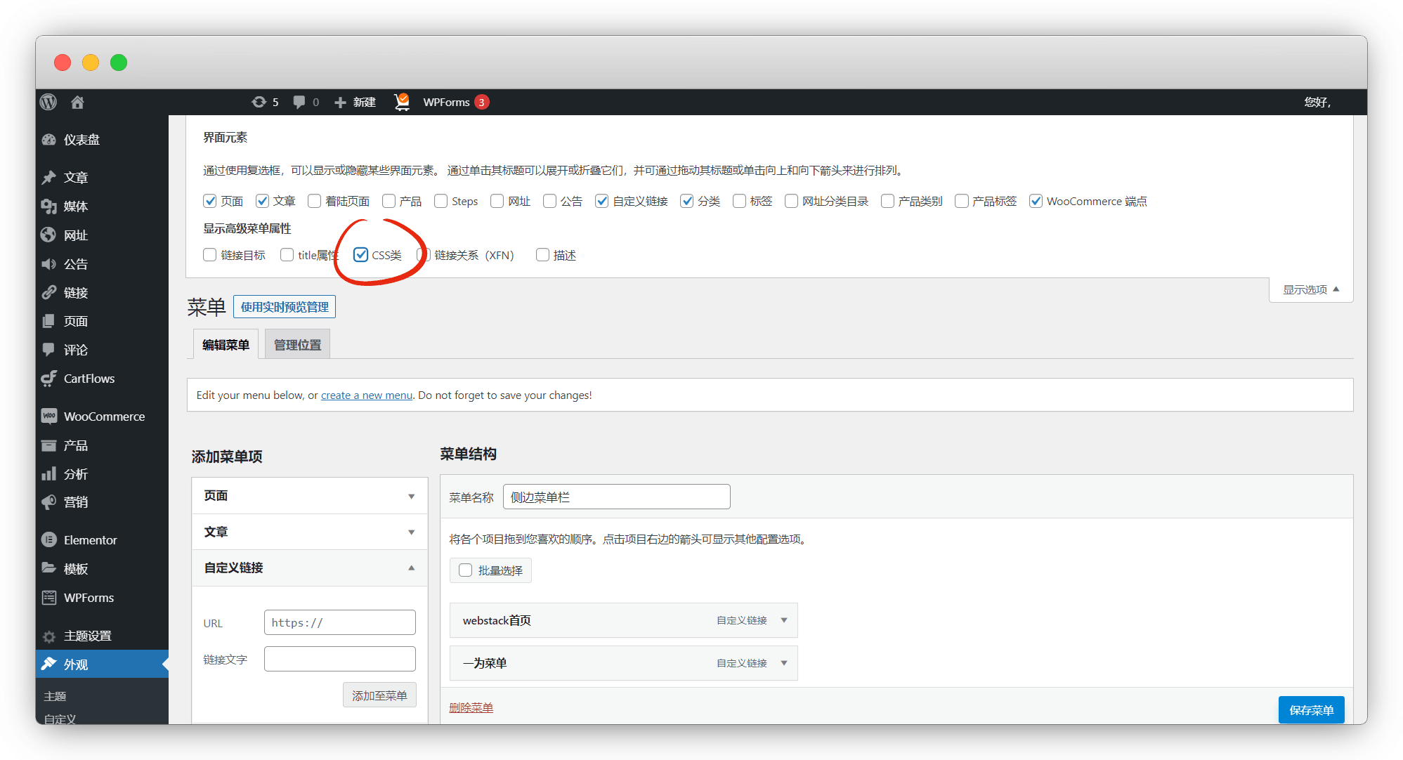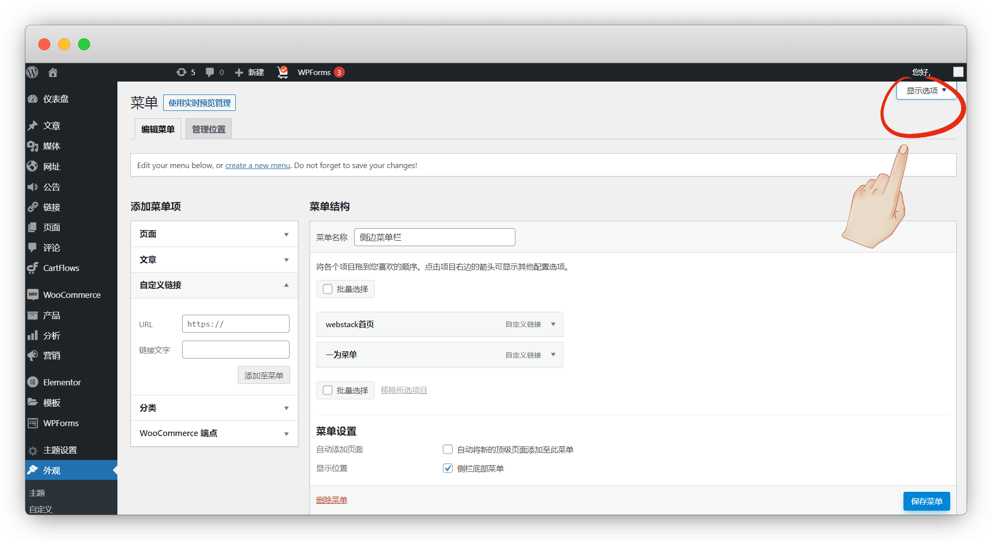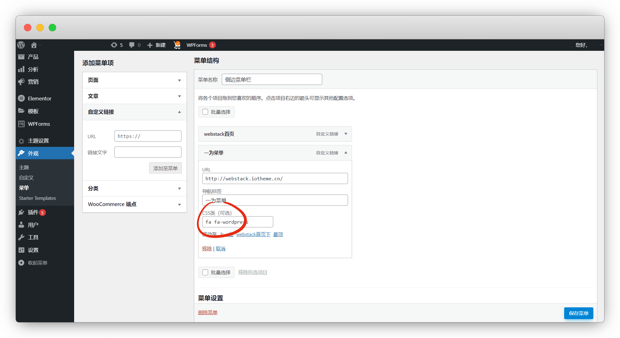 外观-菜单,菜单名称自己取,自定义链接-添加至菜单,然后导航标签写一下,勾选 侧栏底部菜单 ,保存菜单
