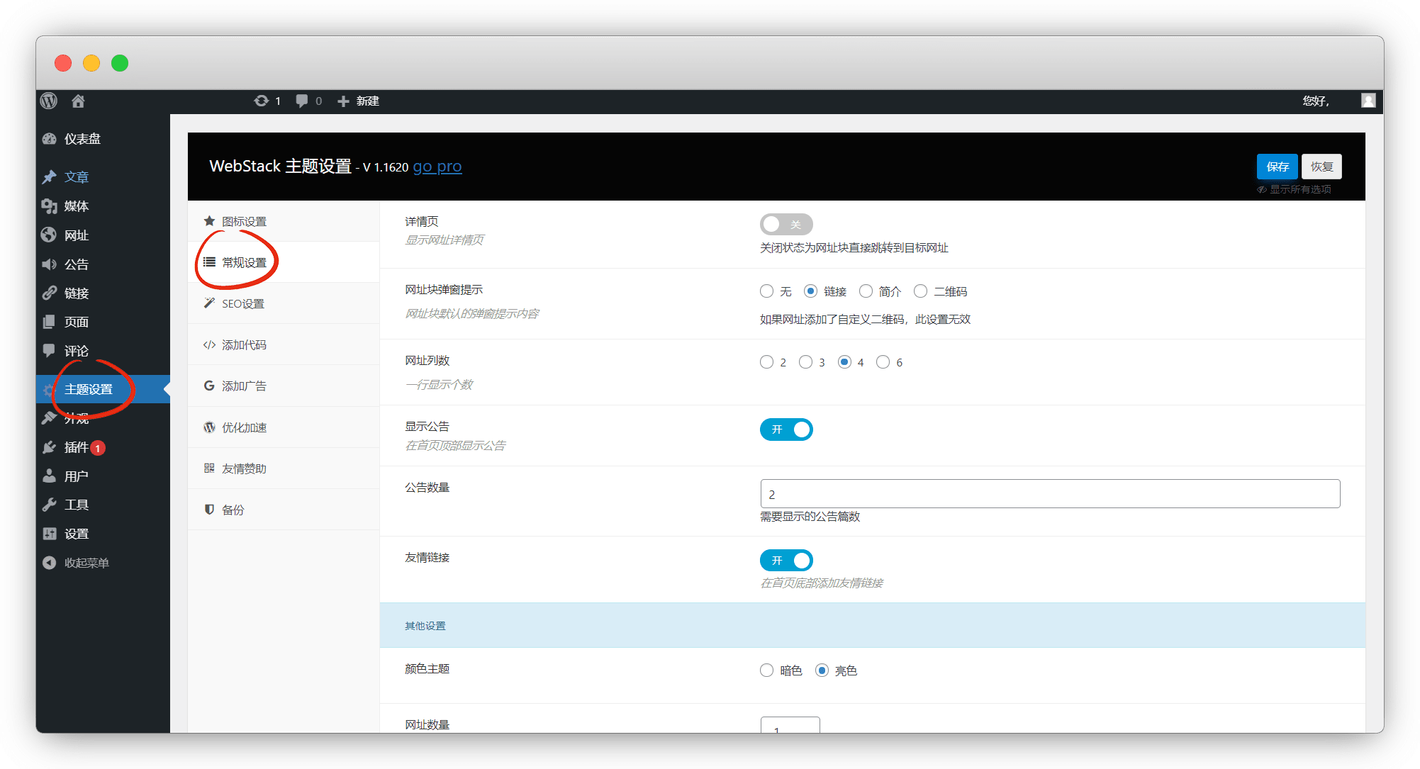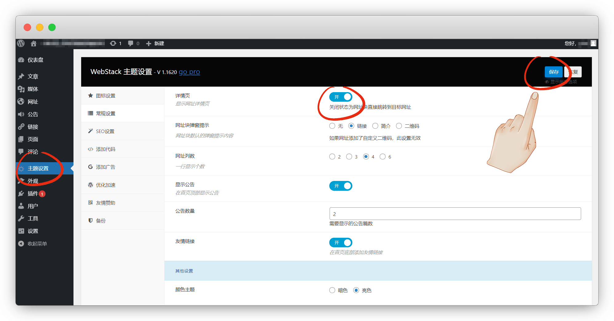 主题-常规设置-显示公告(开启/关闭),这里的公告在wp后台的公告里添加