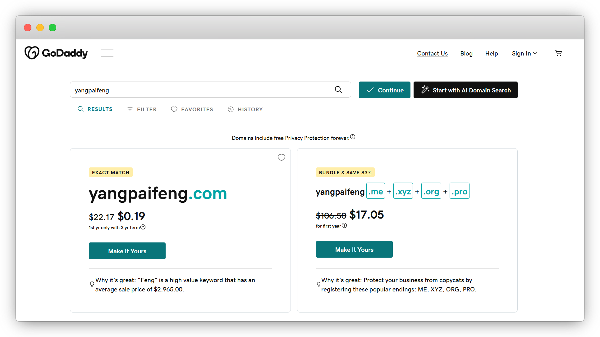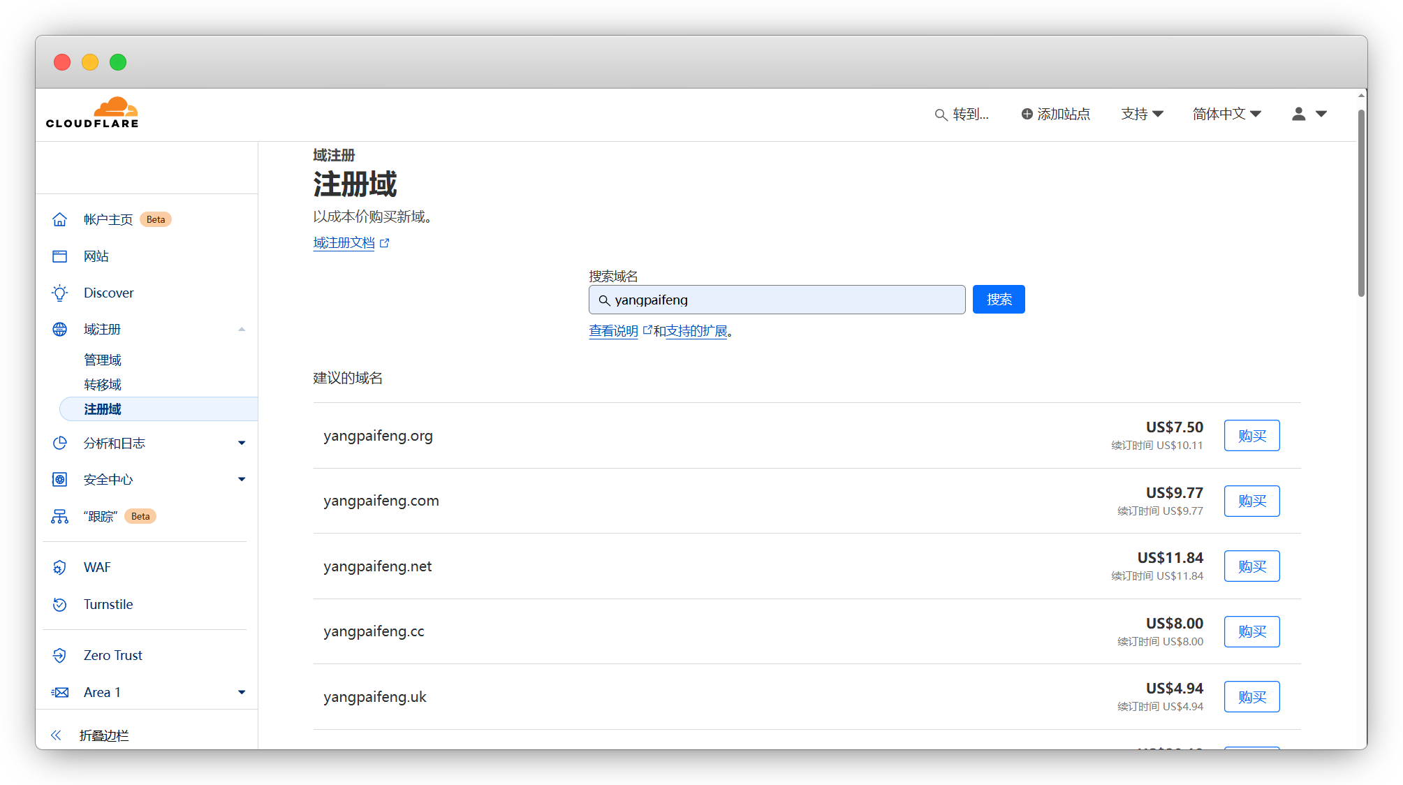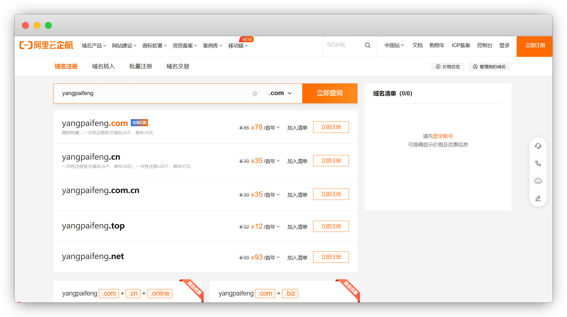 以域名 yangpaifeng 为例,对比域名商价格,仅供参考