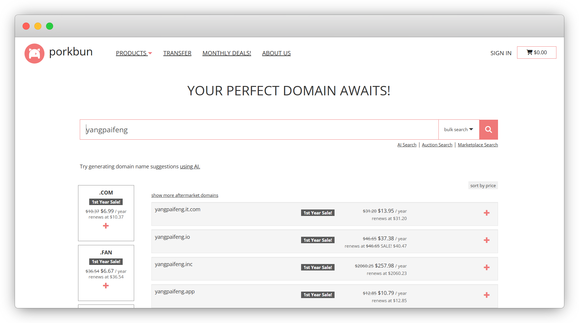 | Porkbun | 🟢 网红类型的域名注册商,域名定价低,续费不变,支持支付宝 🟠 成立时间较短,国内访问起来有一点慢 |