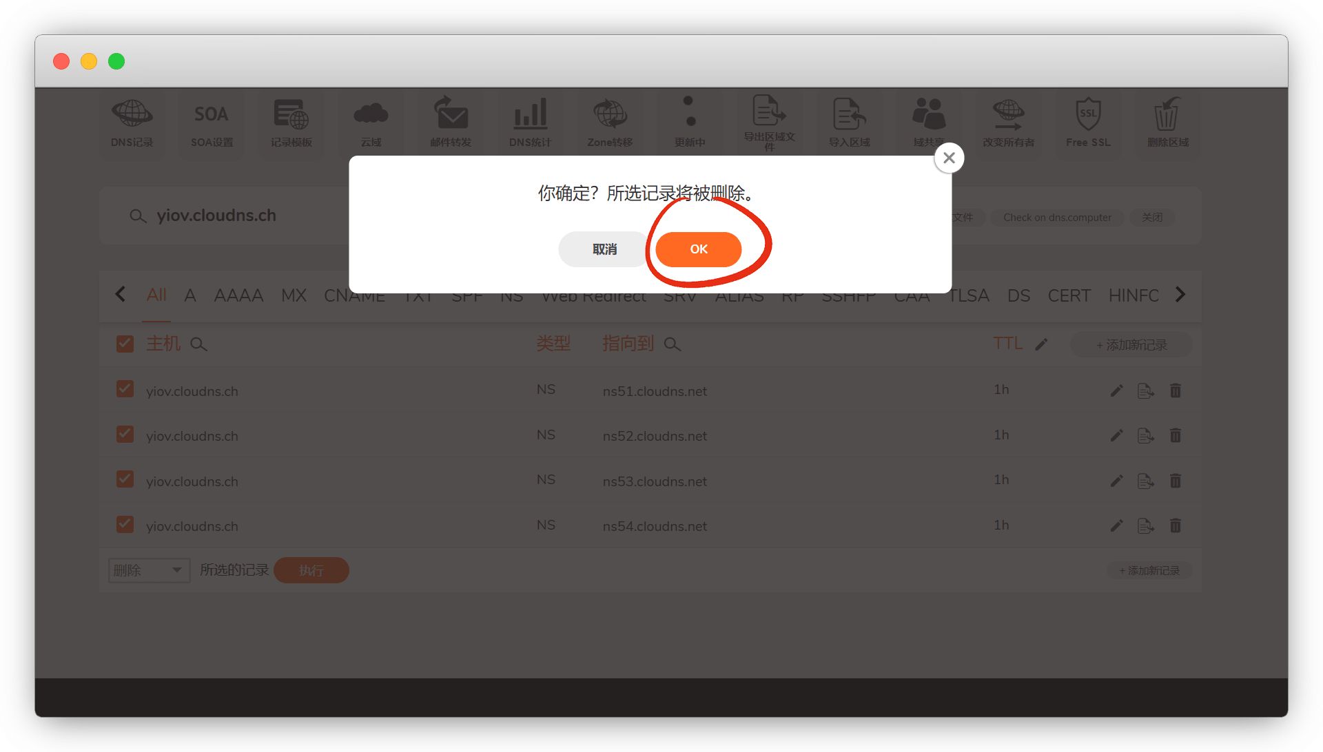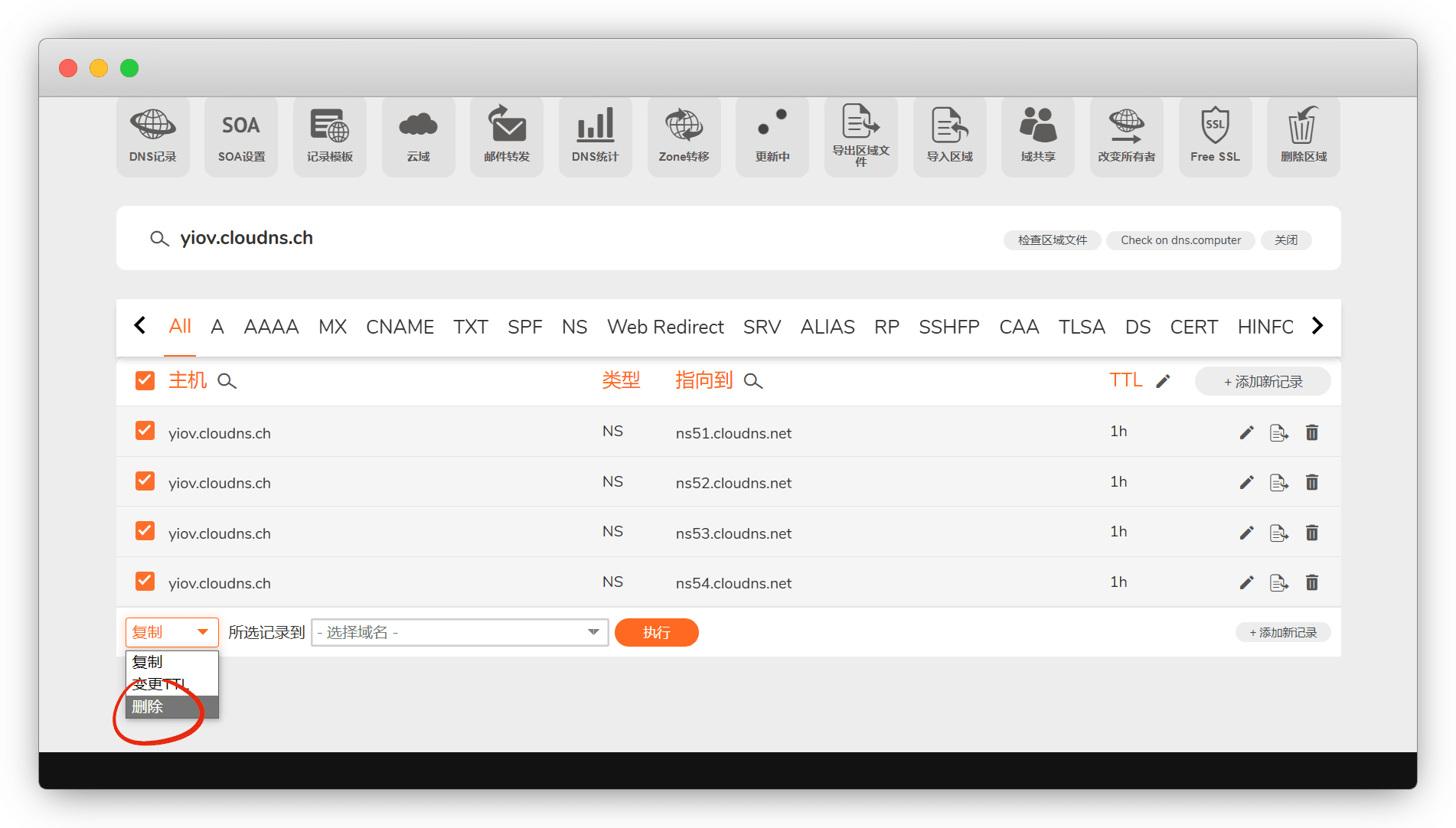 默认的解析记录我们先删掉,后续添加自己想要的即可