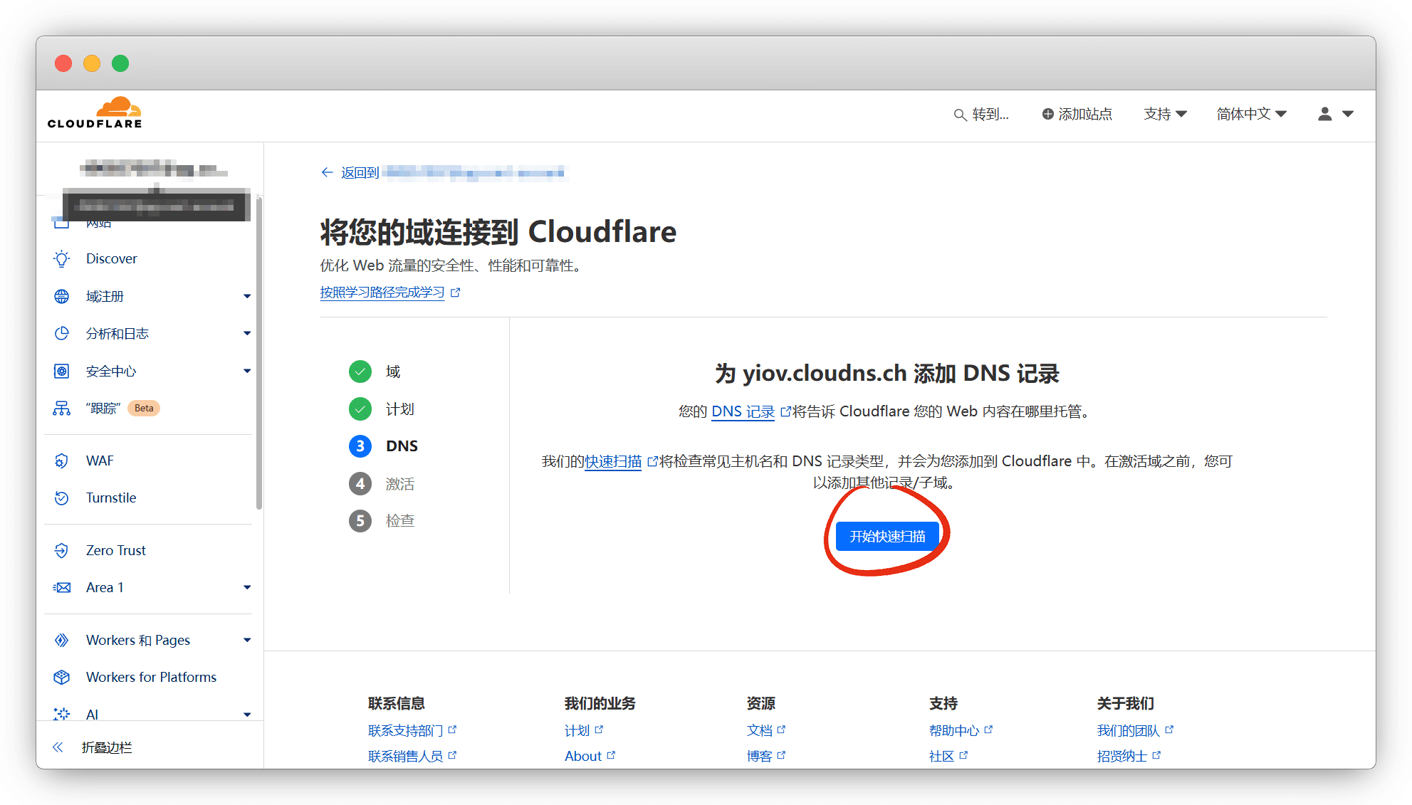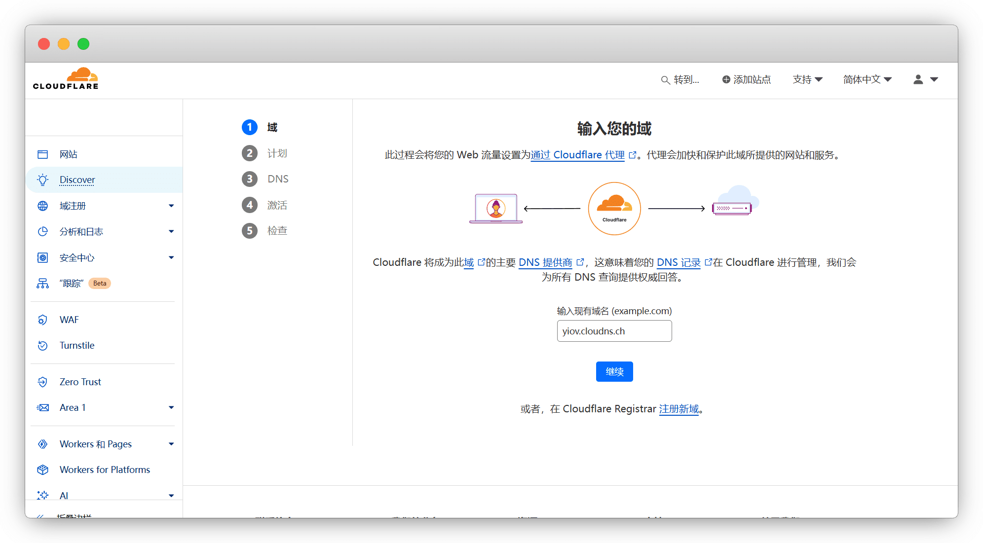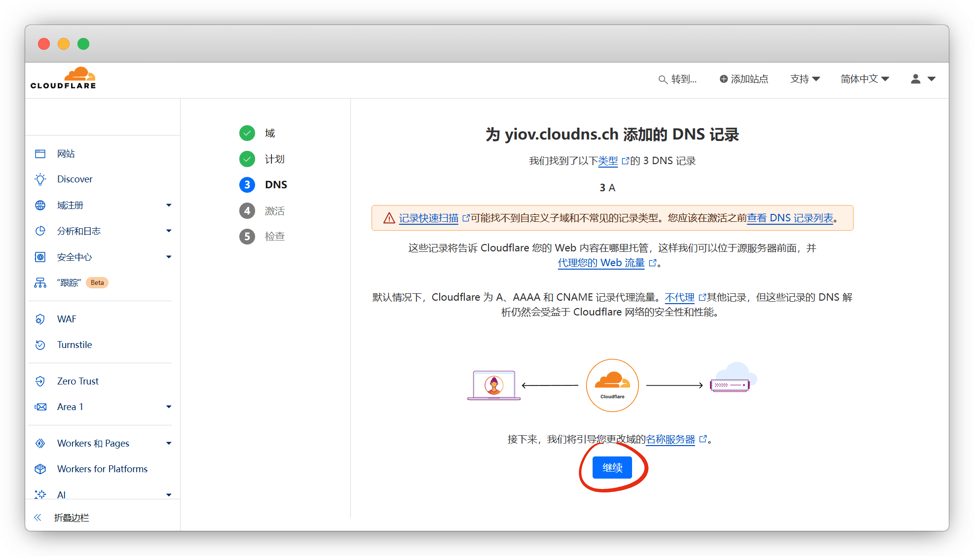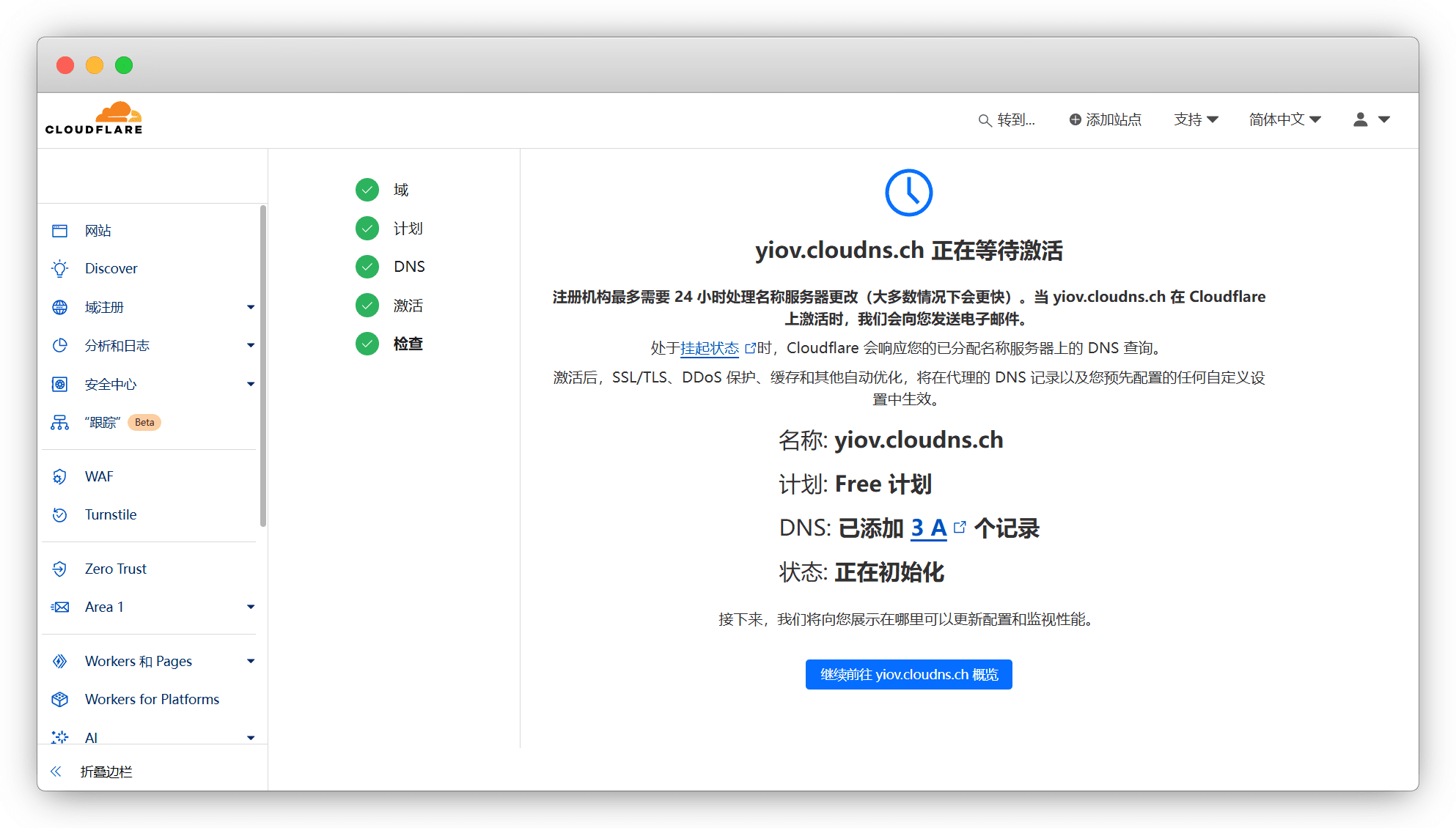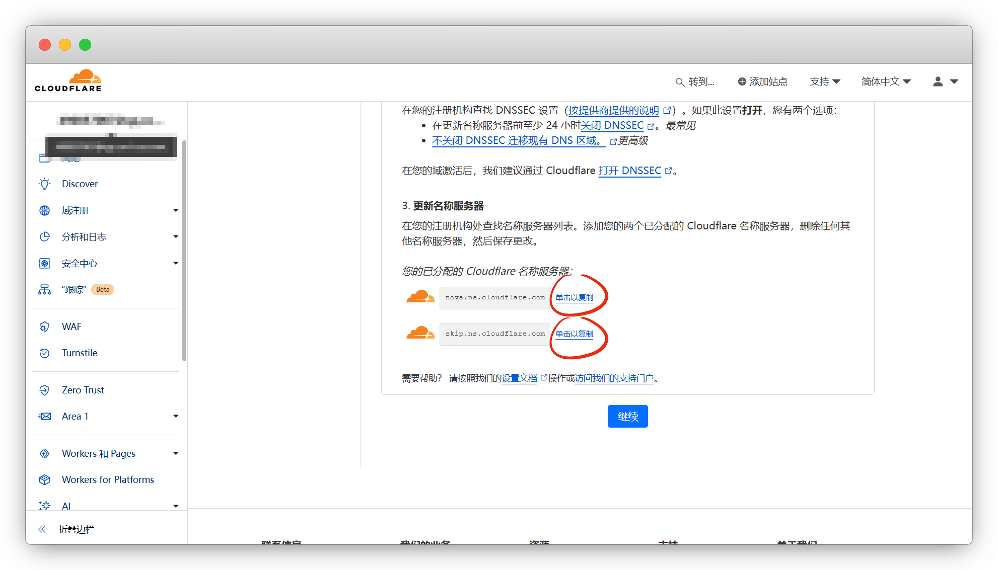 2个服务器地址添加完成后,回到Cloudflare,点继续,等待激活