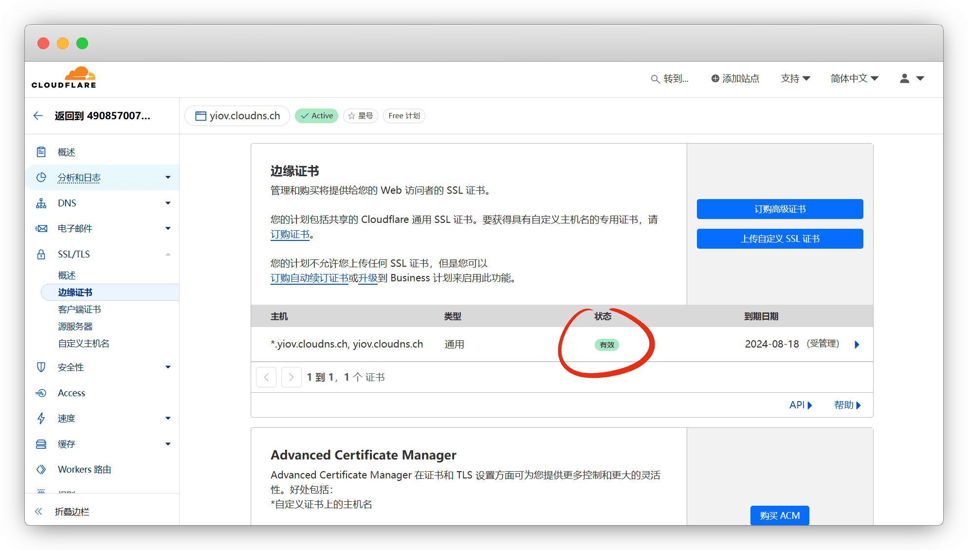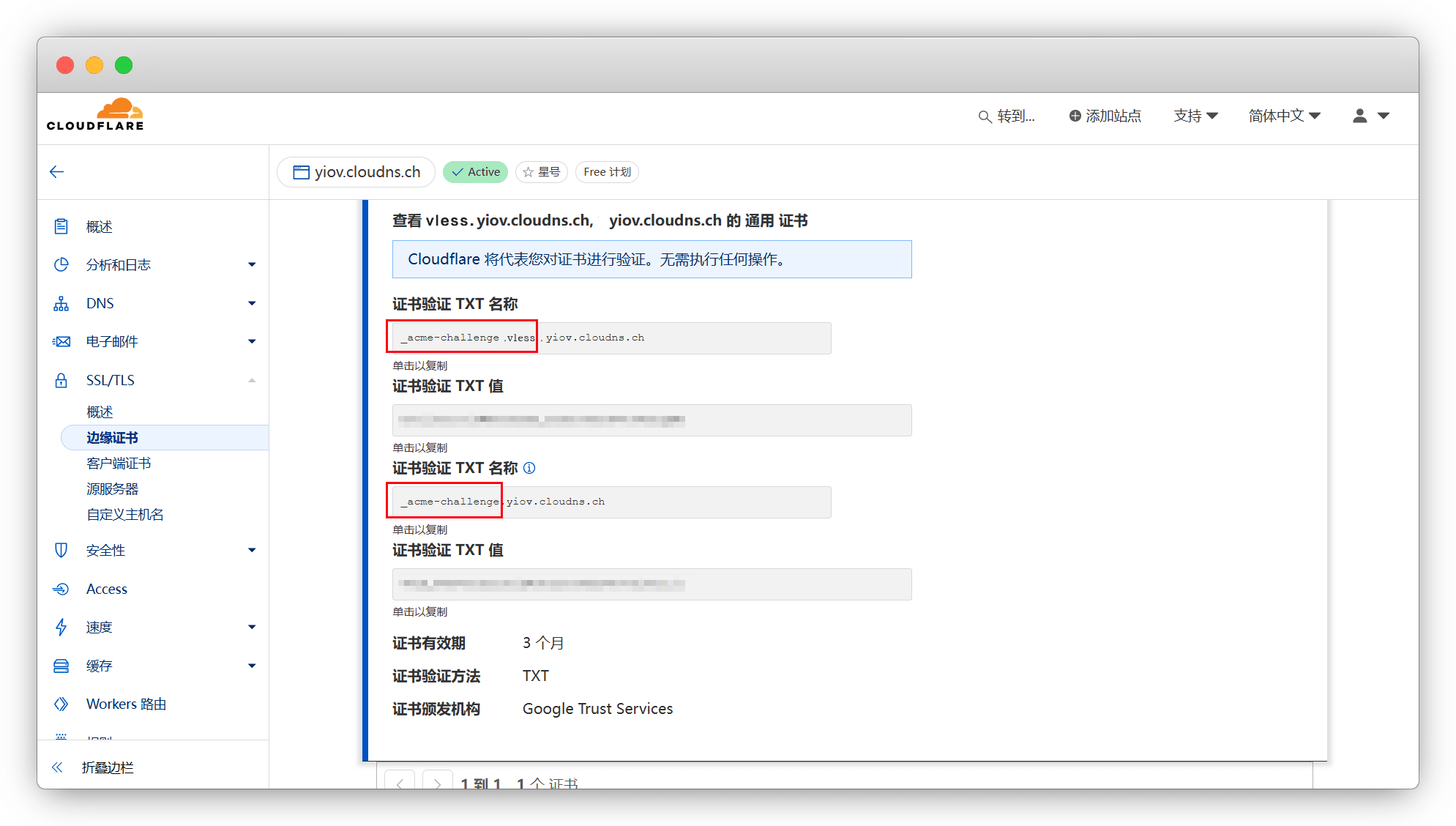然后点击左侧菜单来 SSL/TLS - 边缘证书 ,点展开查看证书