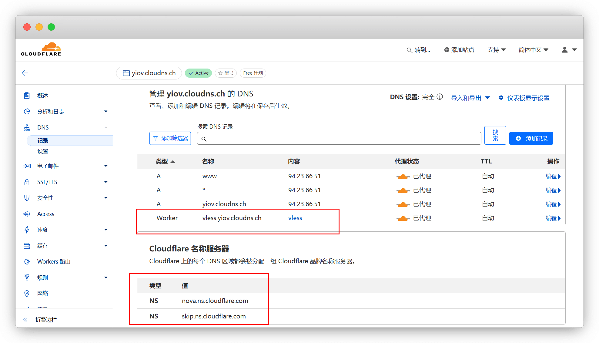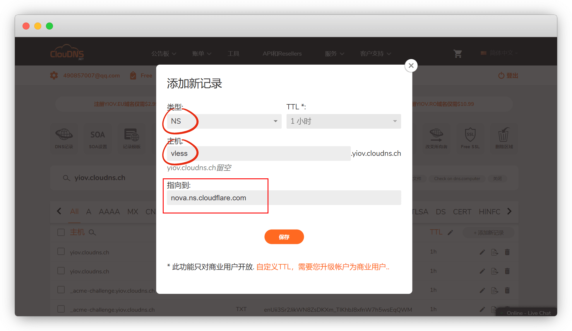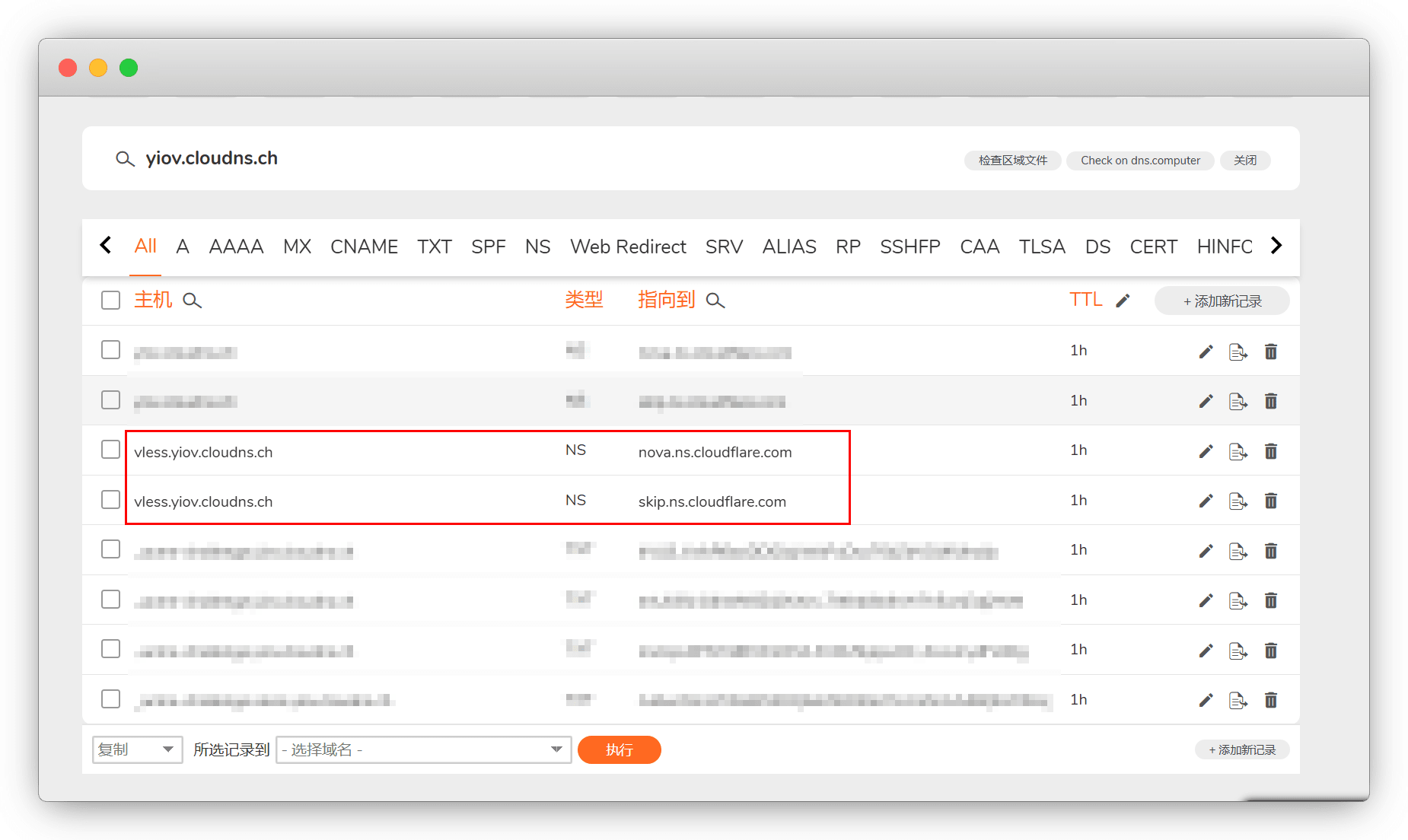 在ClouDNS中添加新记录,类型 NS,主机为你设置的前缀,指向为CloudFlare的NS地址