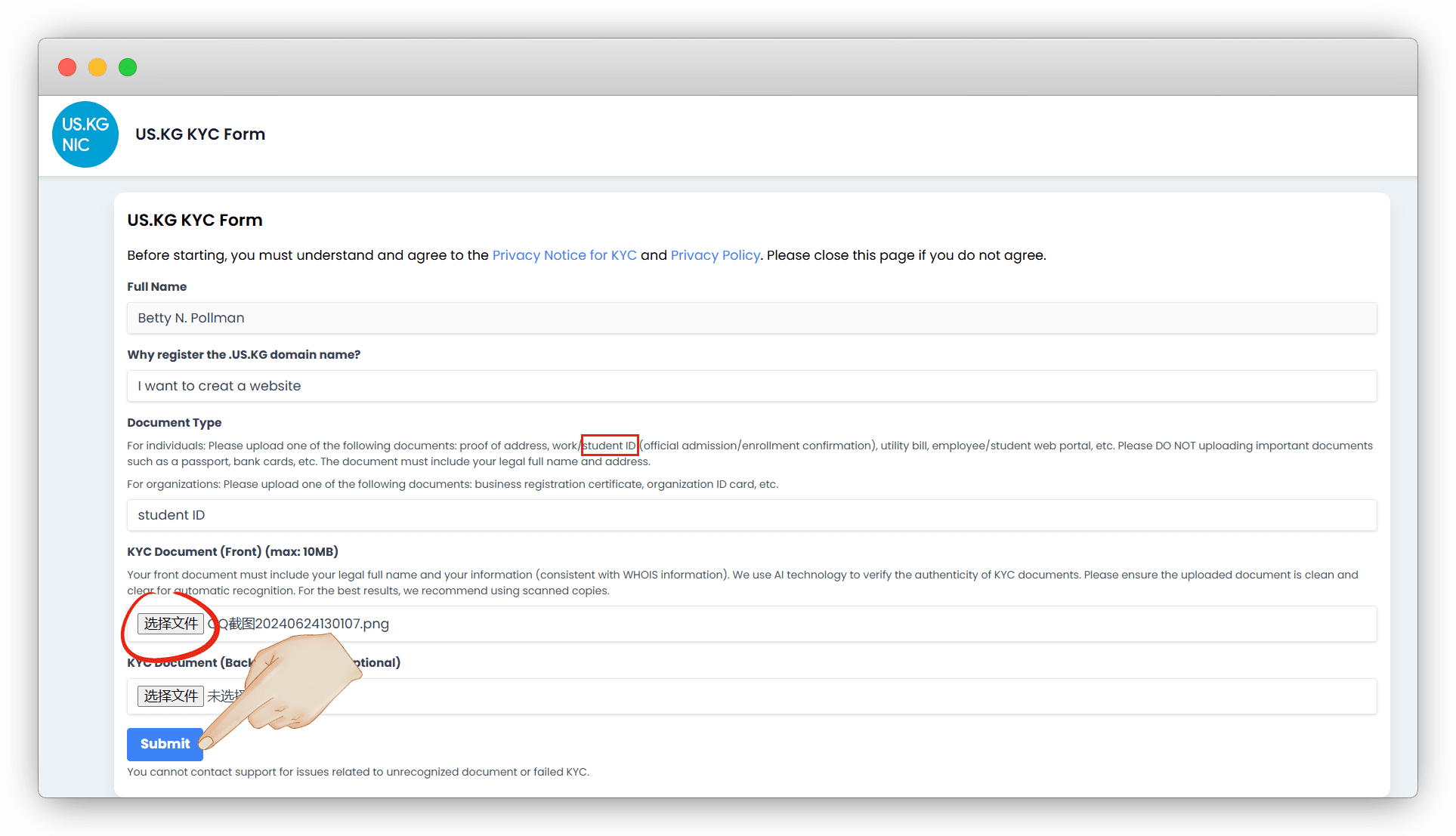 KYC选择刚才 截图生成好的学生证 ,只需要换前面 (Front) ,提交