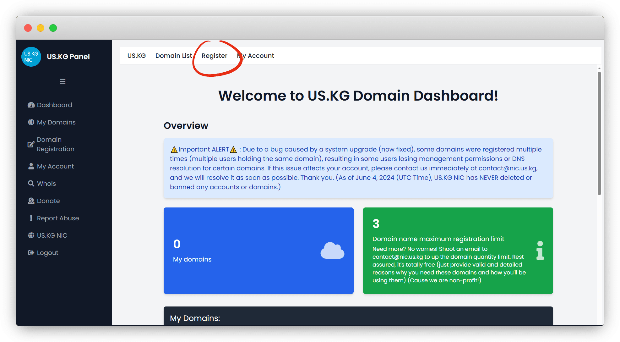 .us.kg账号限制:一个账户可申请3个域名