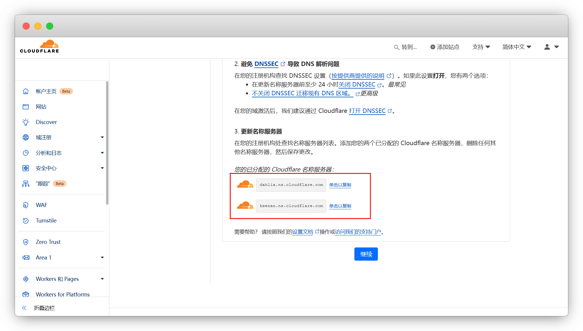 选择免费方案后,会自动给出2个NS值,我们依次复制