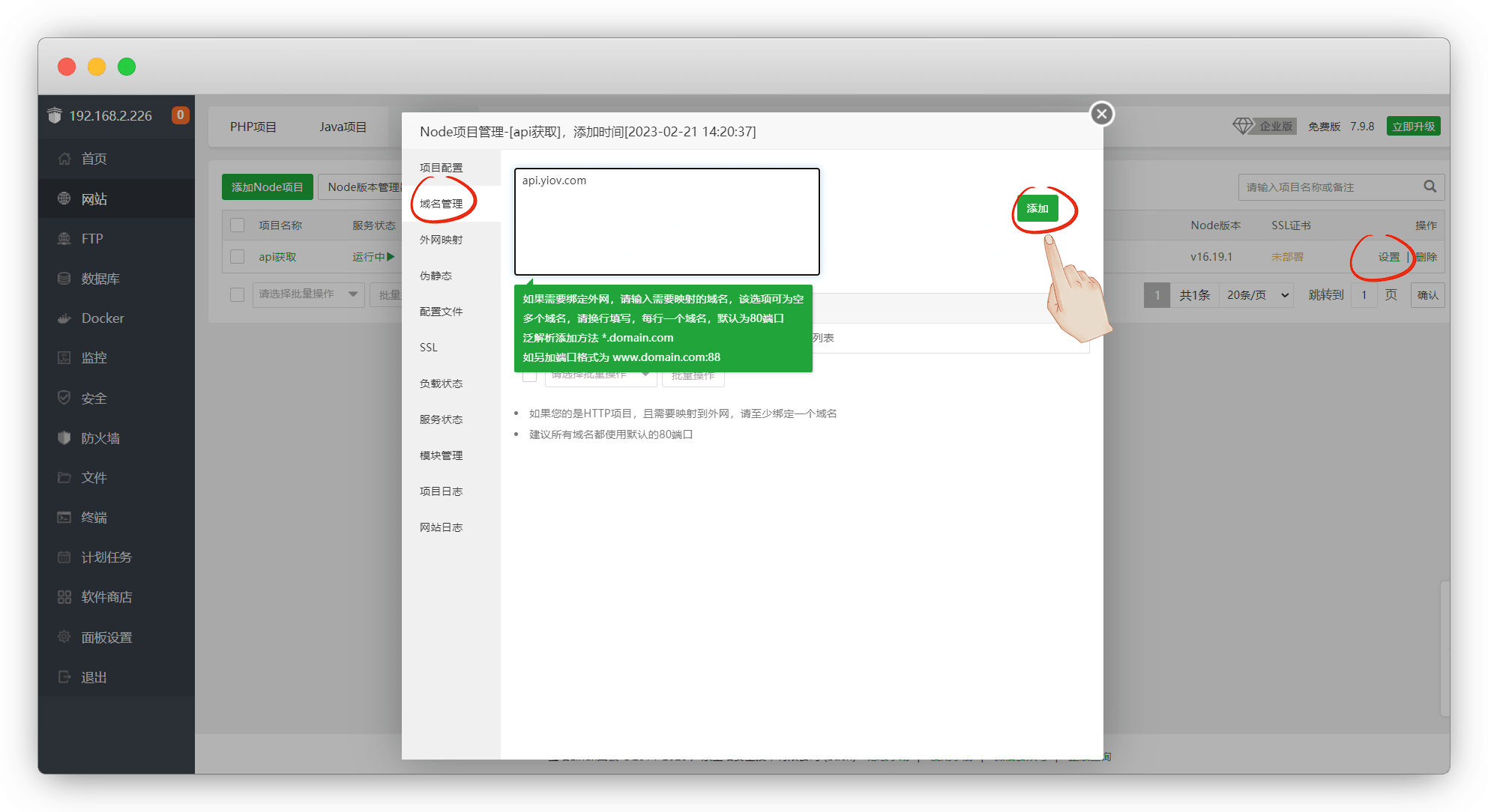 添加成功后,点设置-域名管理,添加一个域名