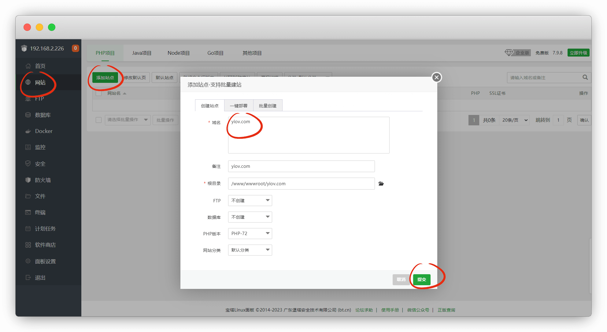 先添加一个站点,输入你的域名,数据库不用创建