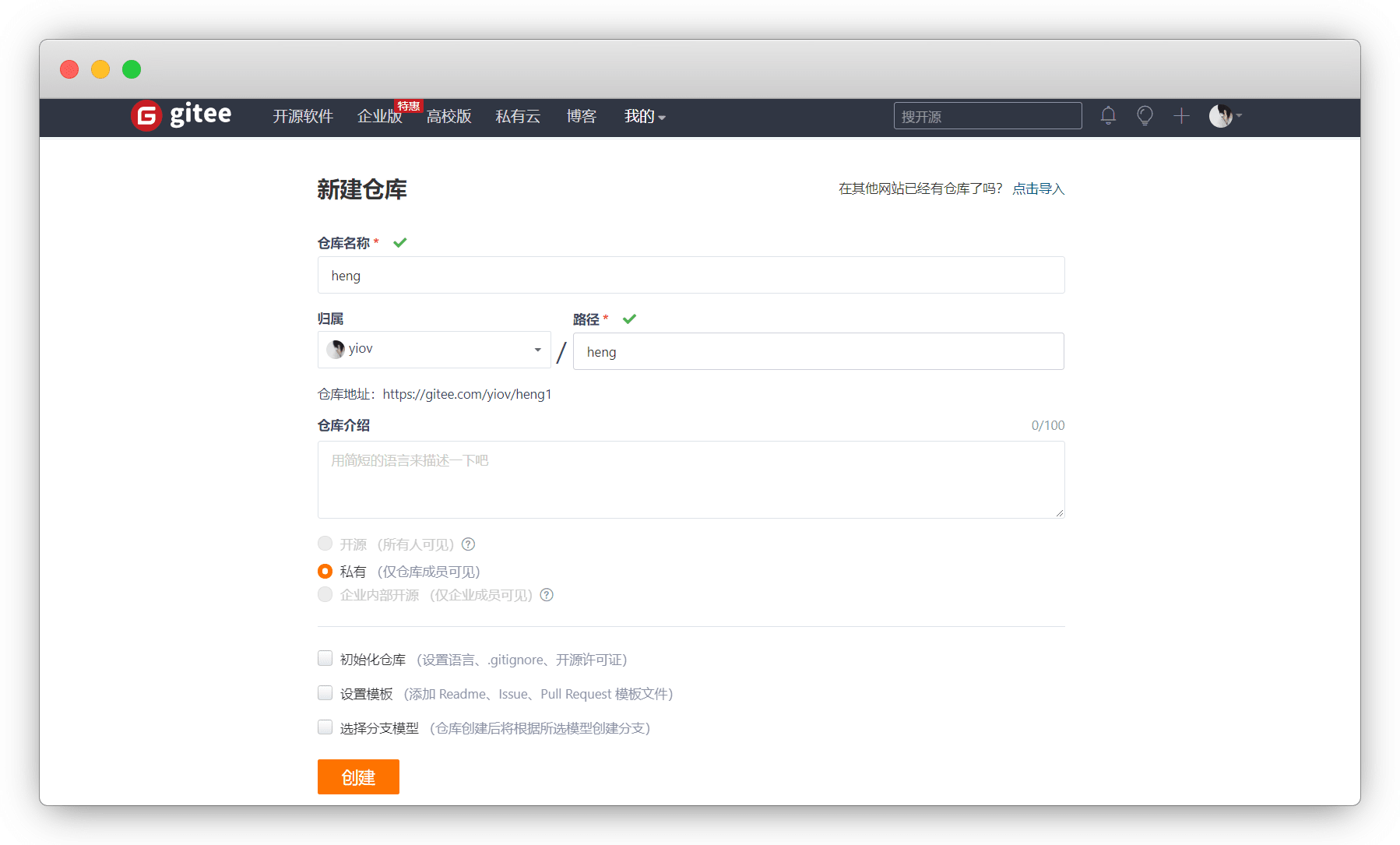 在gitee新建一个仓库,私有/公开都可以,建议私有