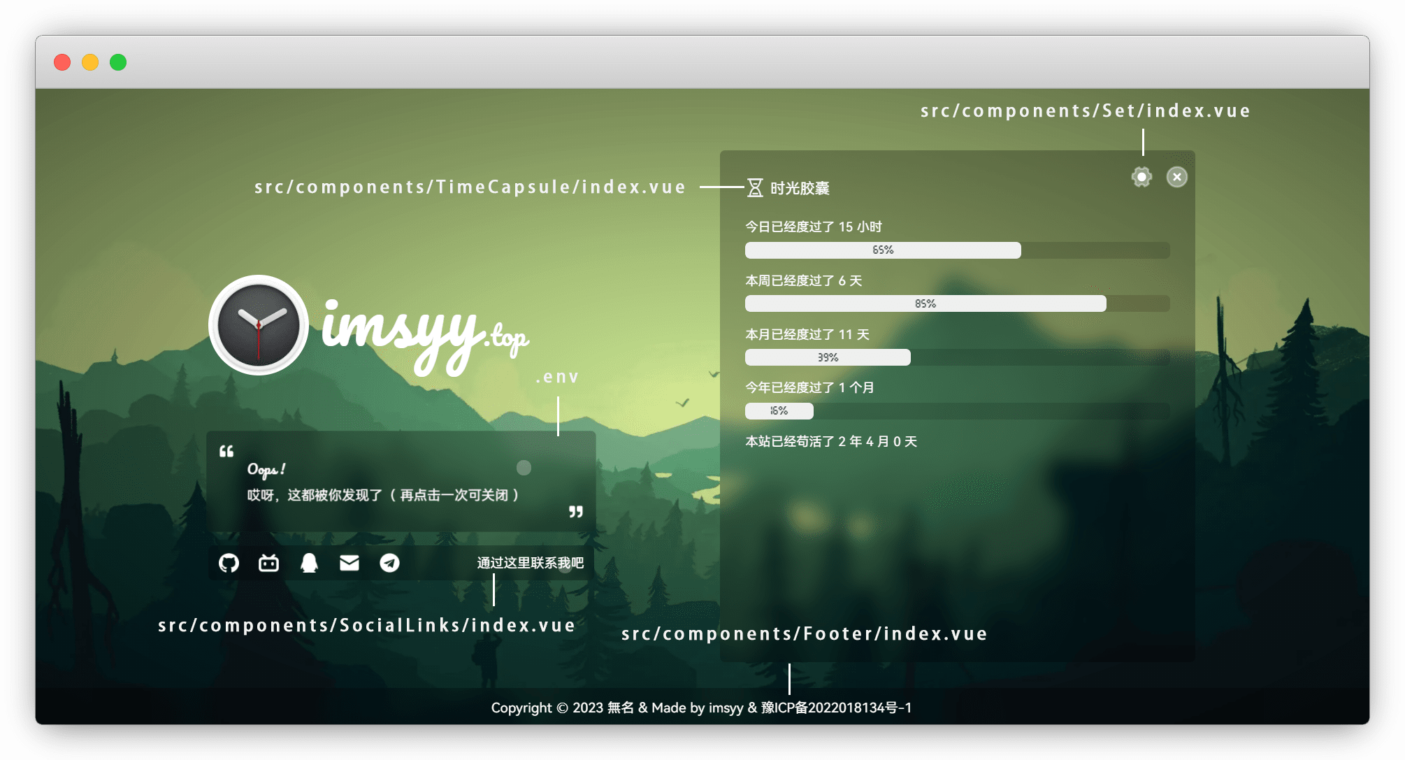 VITE_DESC_TEXT_OTHER = "哎呀,这都被你发现了( 再点击一次可关闭 )"点击简介还能触发时光胶囊,我们在 .env 设置一下建站日期即可