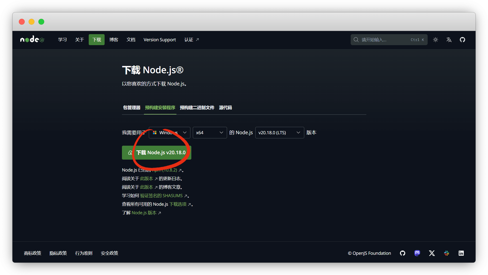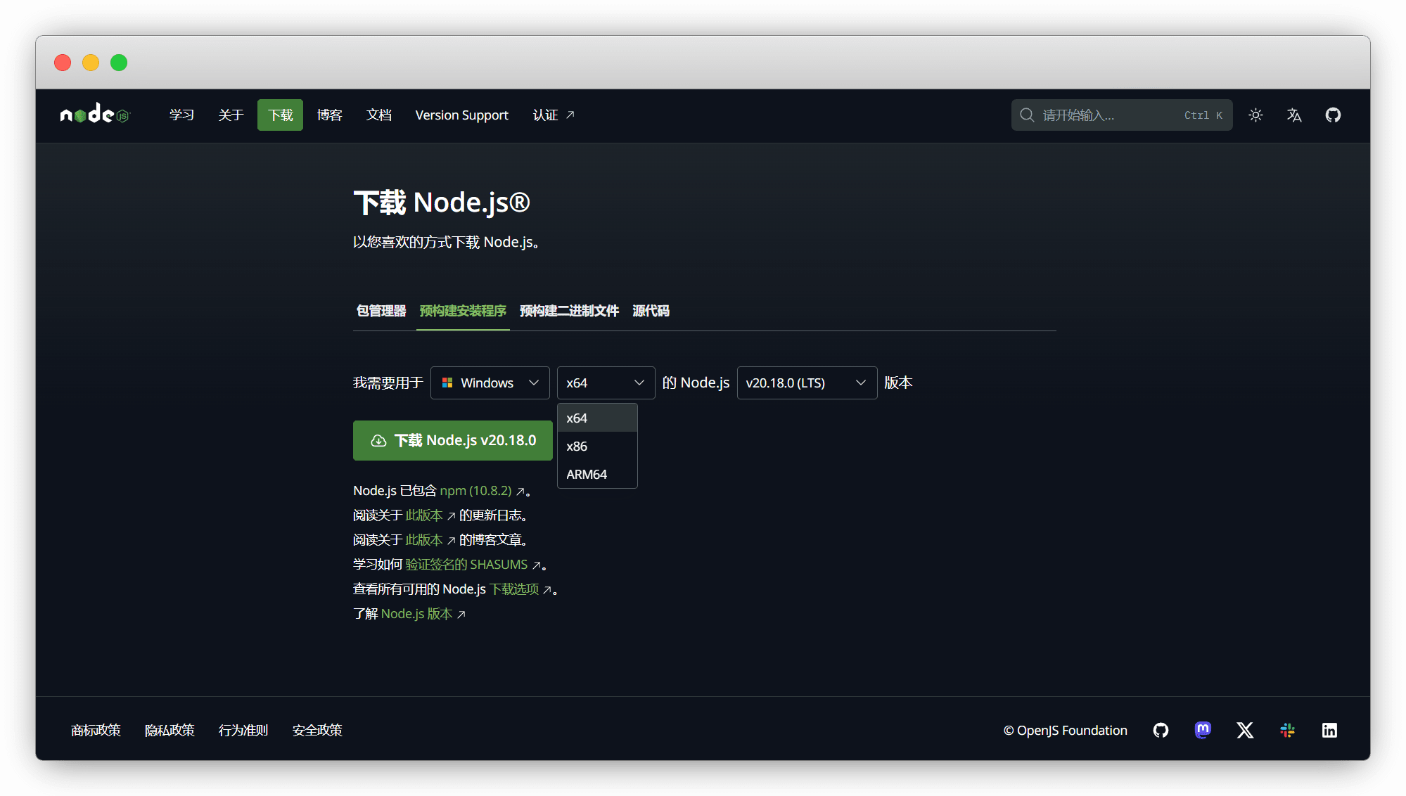 选择window x64(自己的电脑系统类型), LTS(Long-term support,长期维护版)