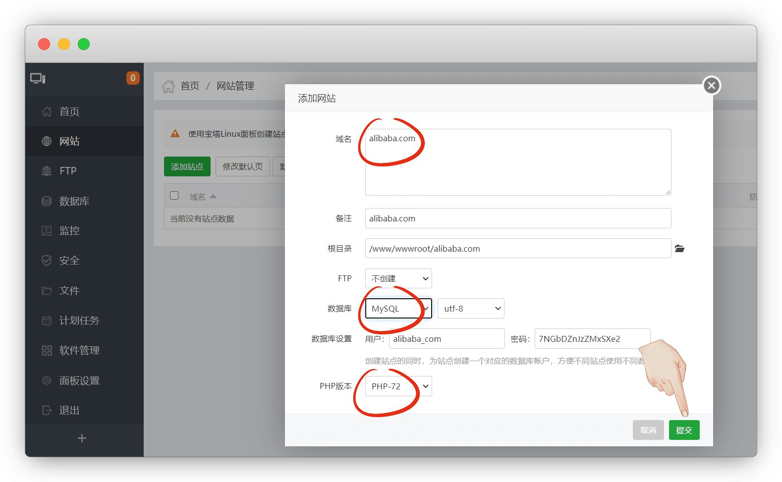 新建站点,输入我们的域名,选择数据库MySQL,核对下PHP版本后提交