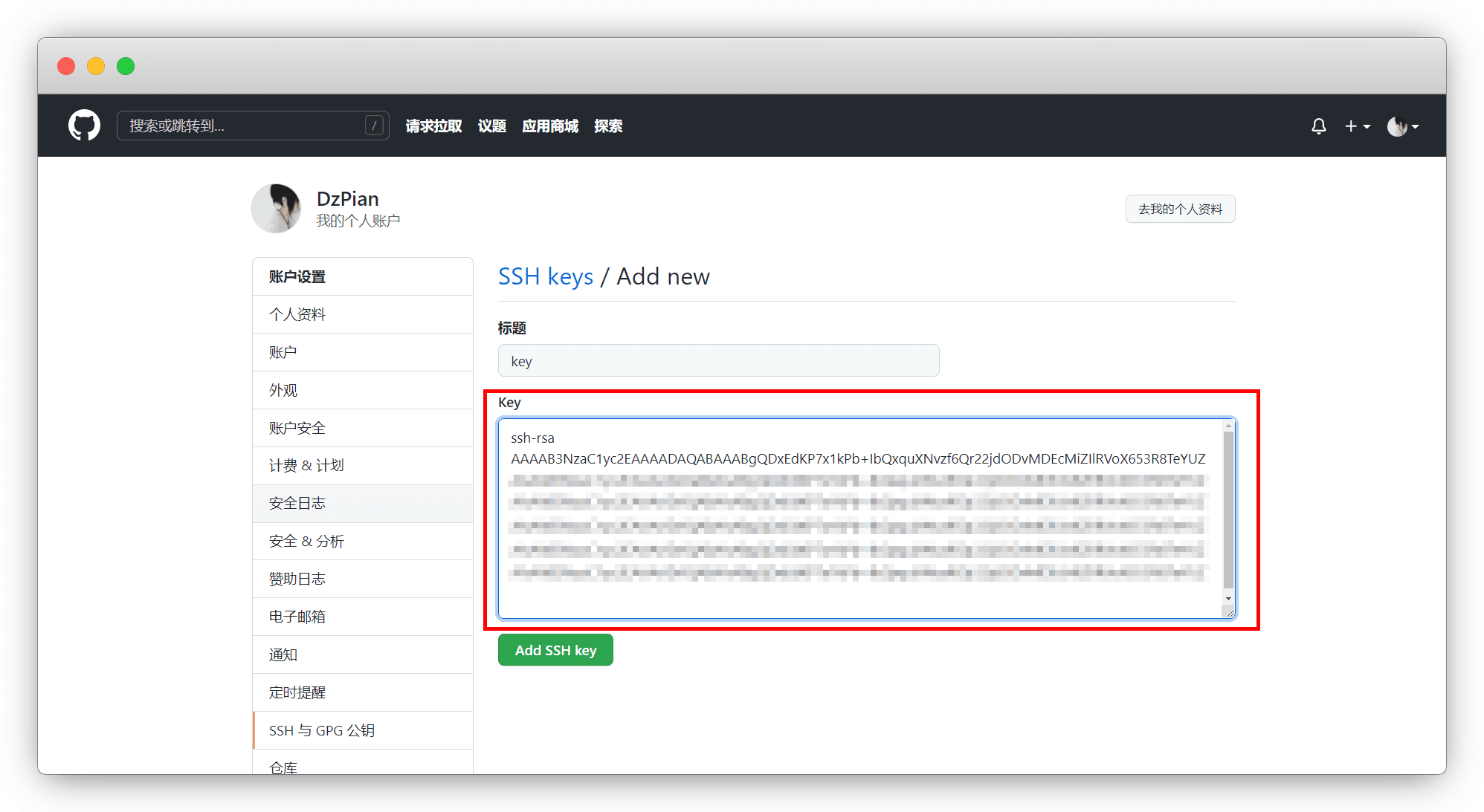 标题随便起,key是刚刚生成的SSH key,全选了,复制粘贴进去