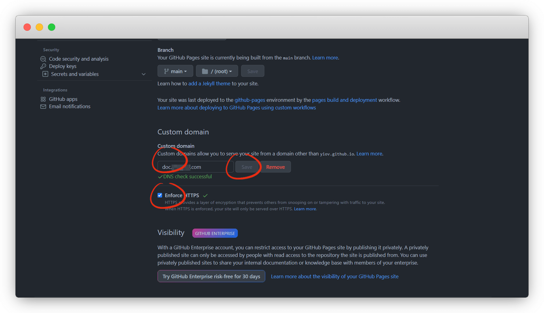 回到github设置,下拉在自定义域名里填入我们的二级域名,保存