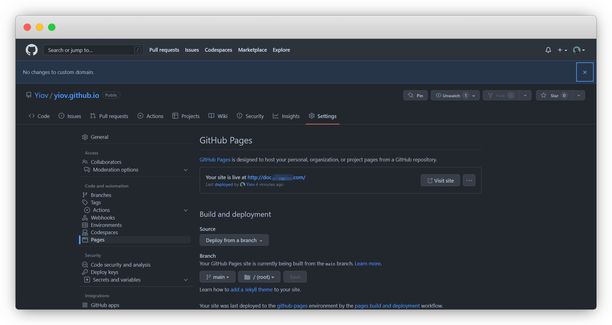 在 Setting - page 这里的 https://yiov.github.io 就是我们的网页了