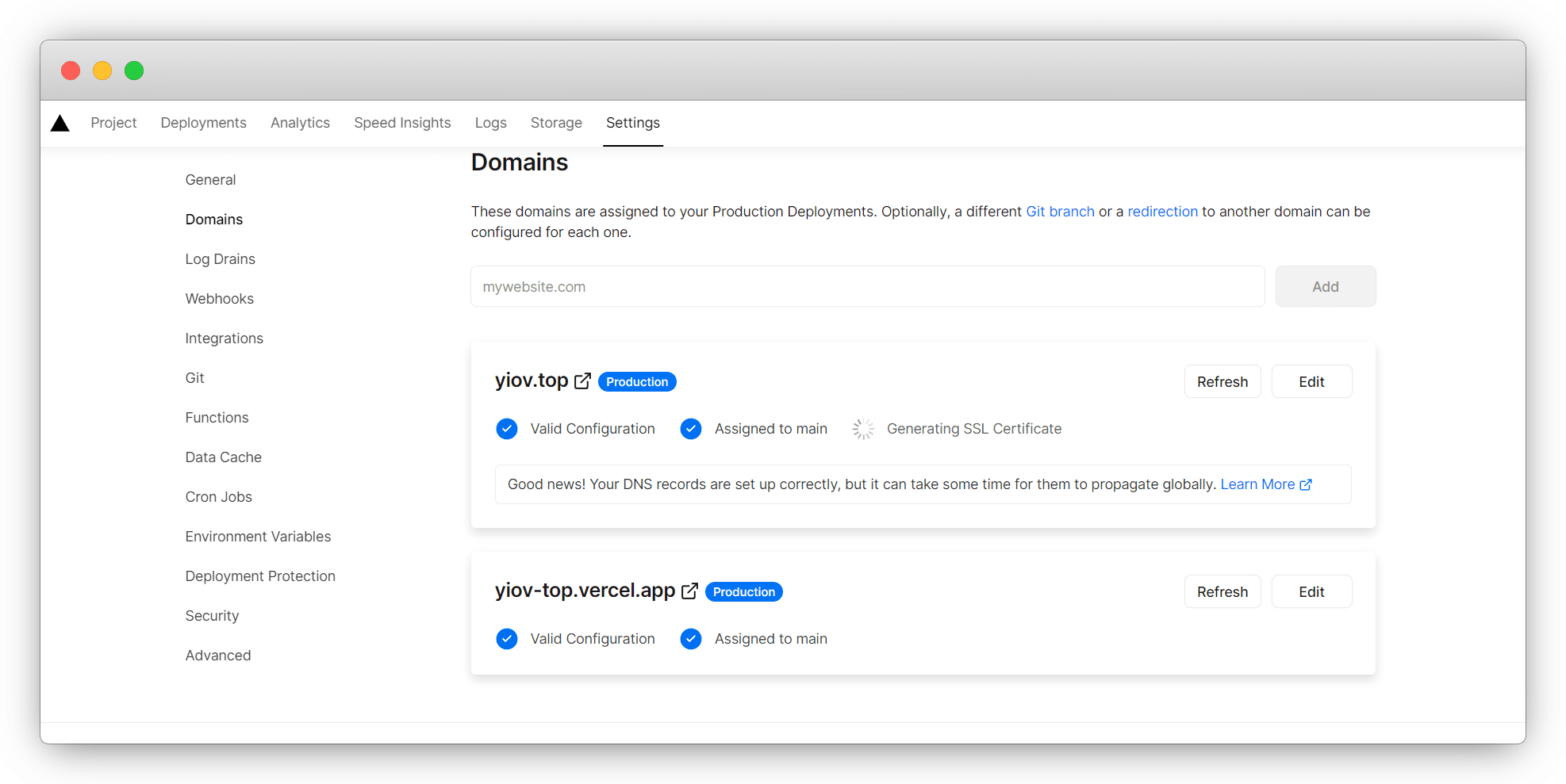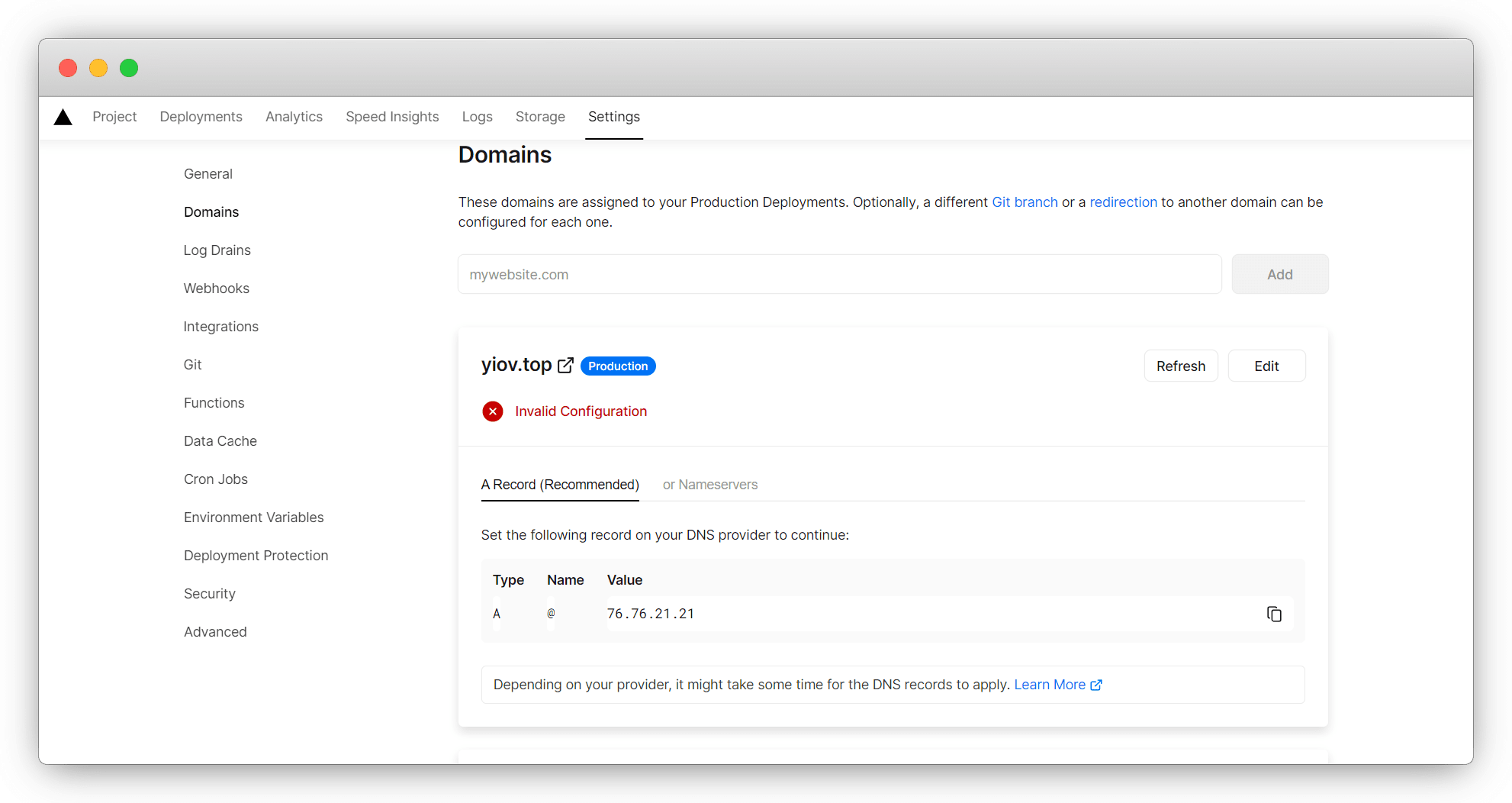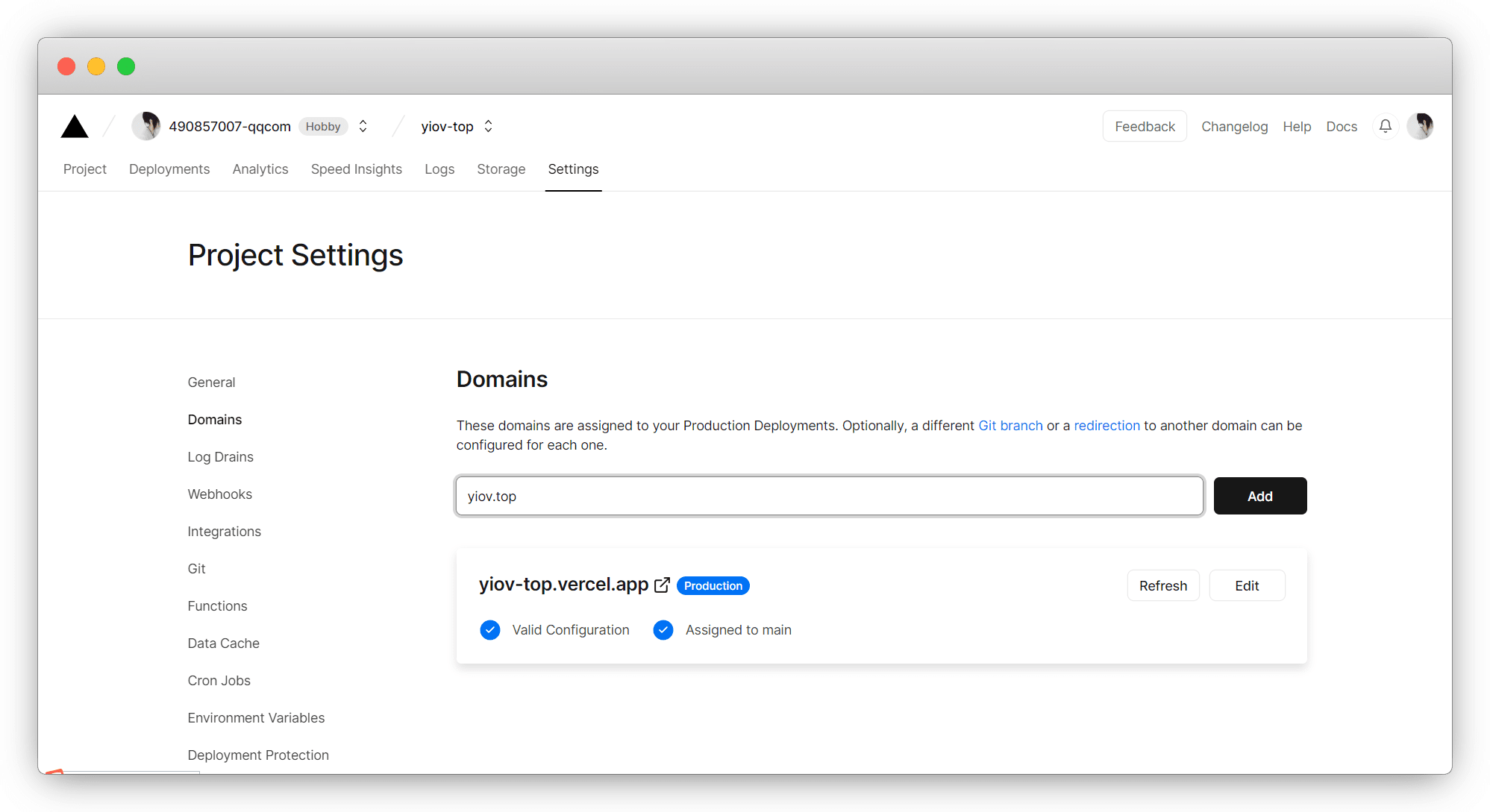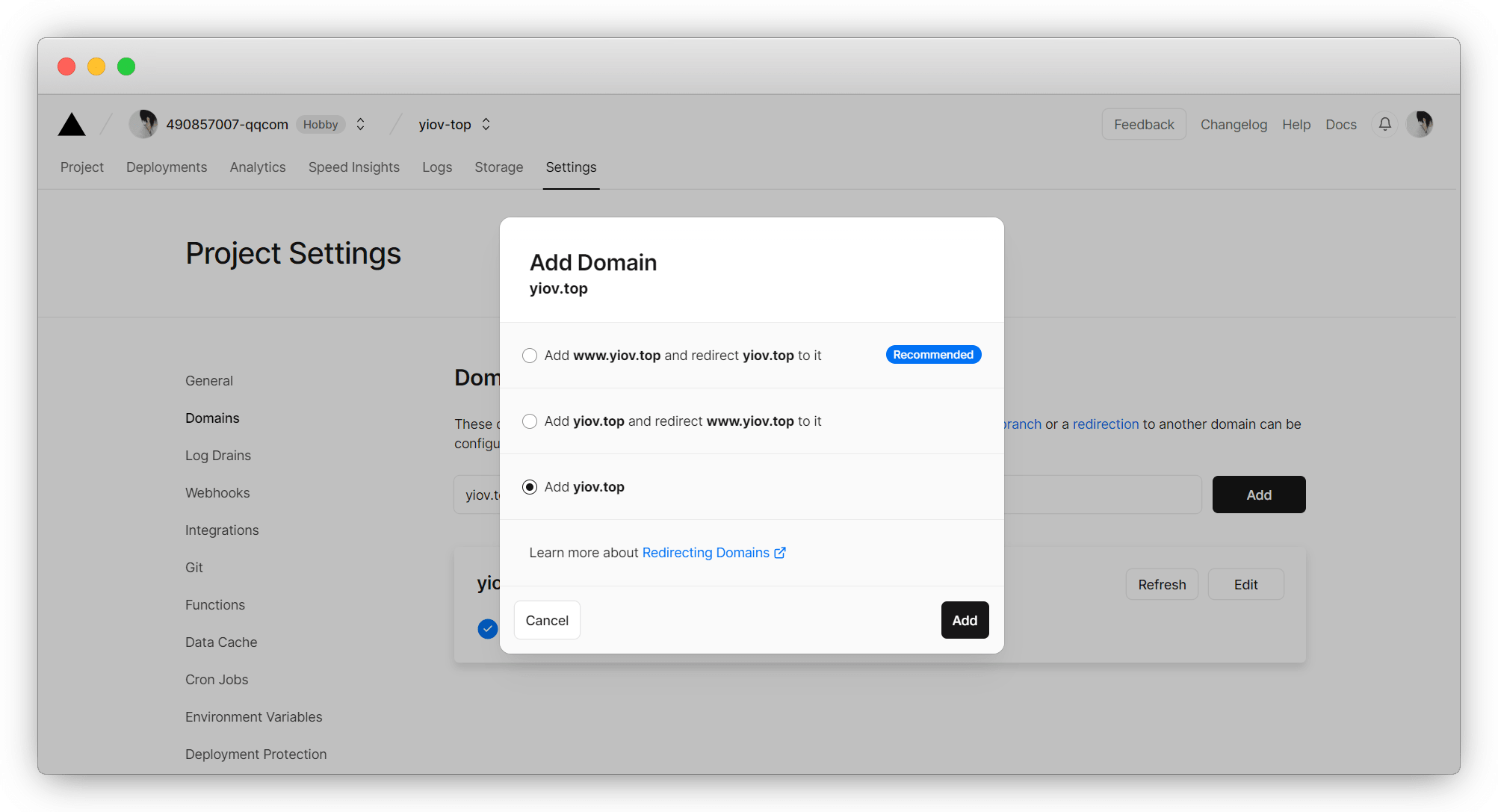 点击 Domains 进入域名管理,这里输入我们自己的域名 Add 添加