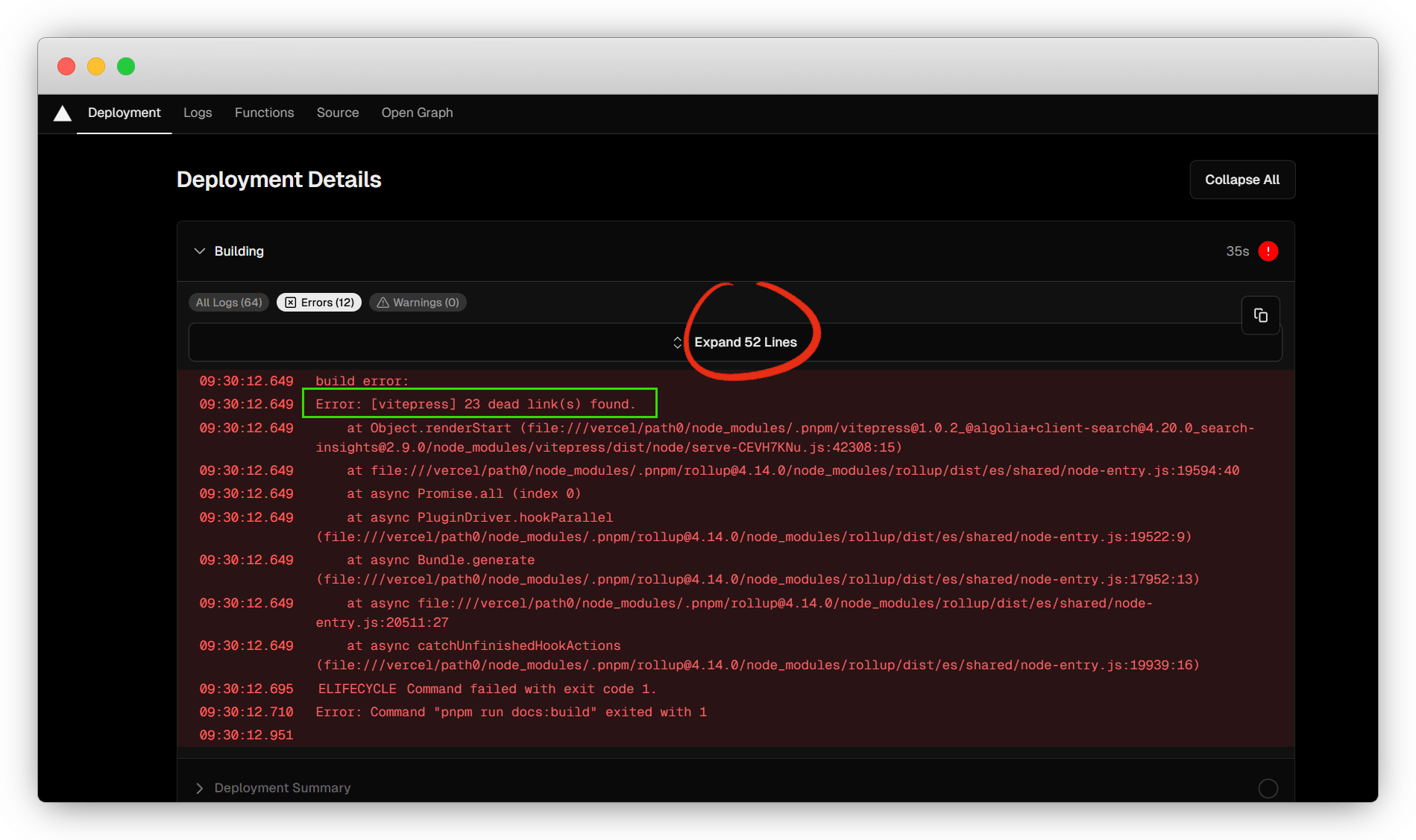 部署失败后,可以点击 Error 查看什么原因