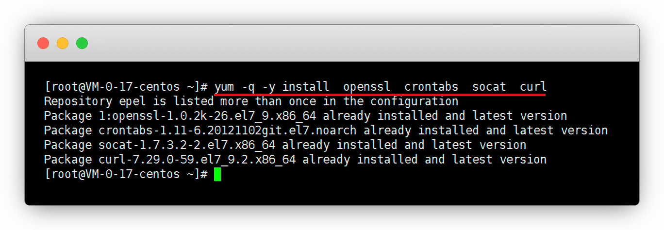 yum -q -y install openssl crontabs socat curl