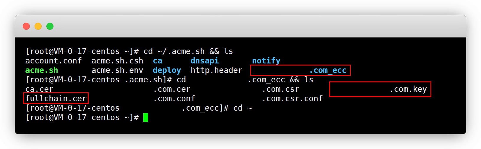 cd ~!说明:其中 *.key 和 fullchain.cer 是安装所需要的文件