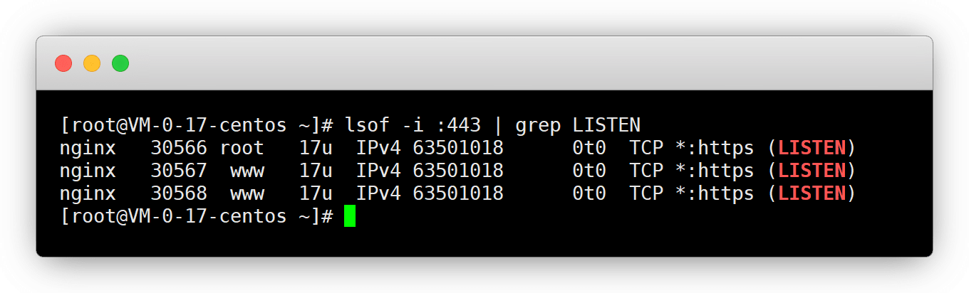 lsof -i :443 | grep LISTEN未占用就直接申请,如下图被占用,改端口申请即可