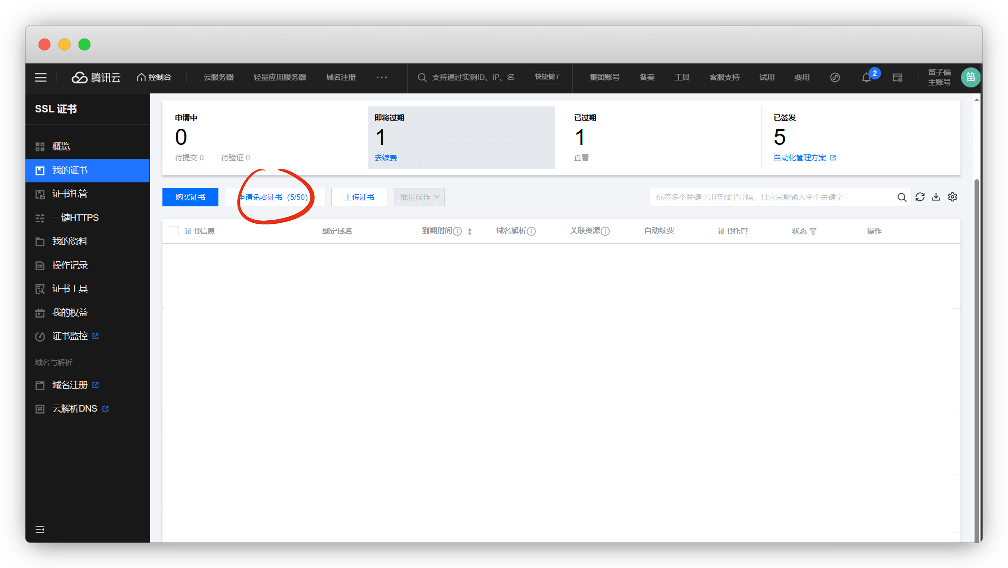 登录账号进入 控制台 - SSL证书 ,我的证书 - 申请免费证书(0/50)