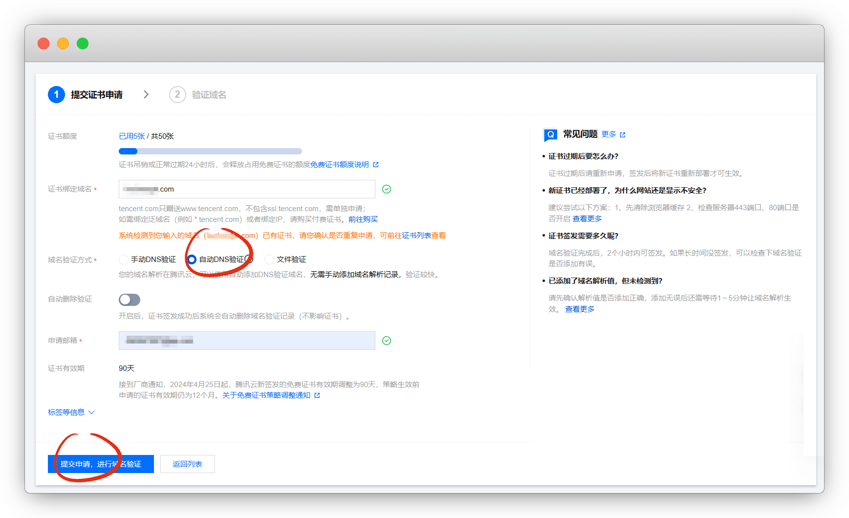 输入我们的域名,选择 自动DNS验证,填入邮箱,提交申请