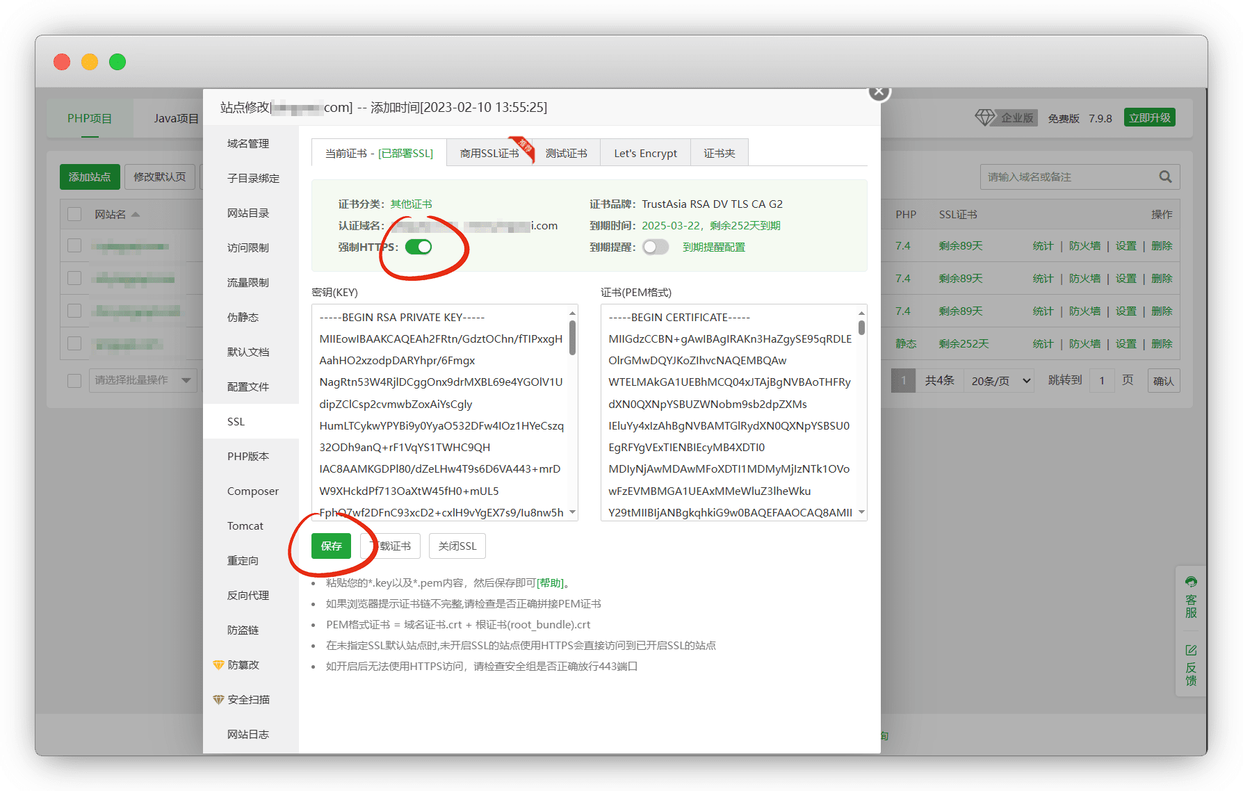 分别粘贴到框里,保存,并开启强制HTTPS