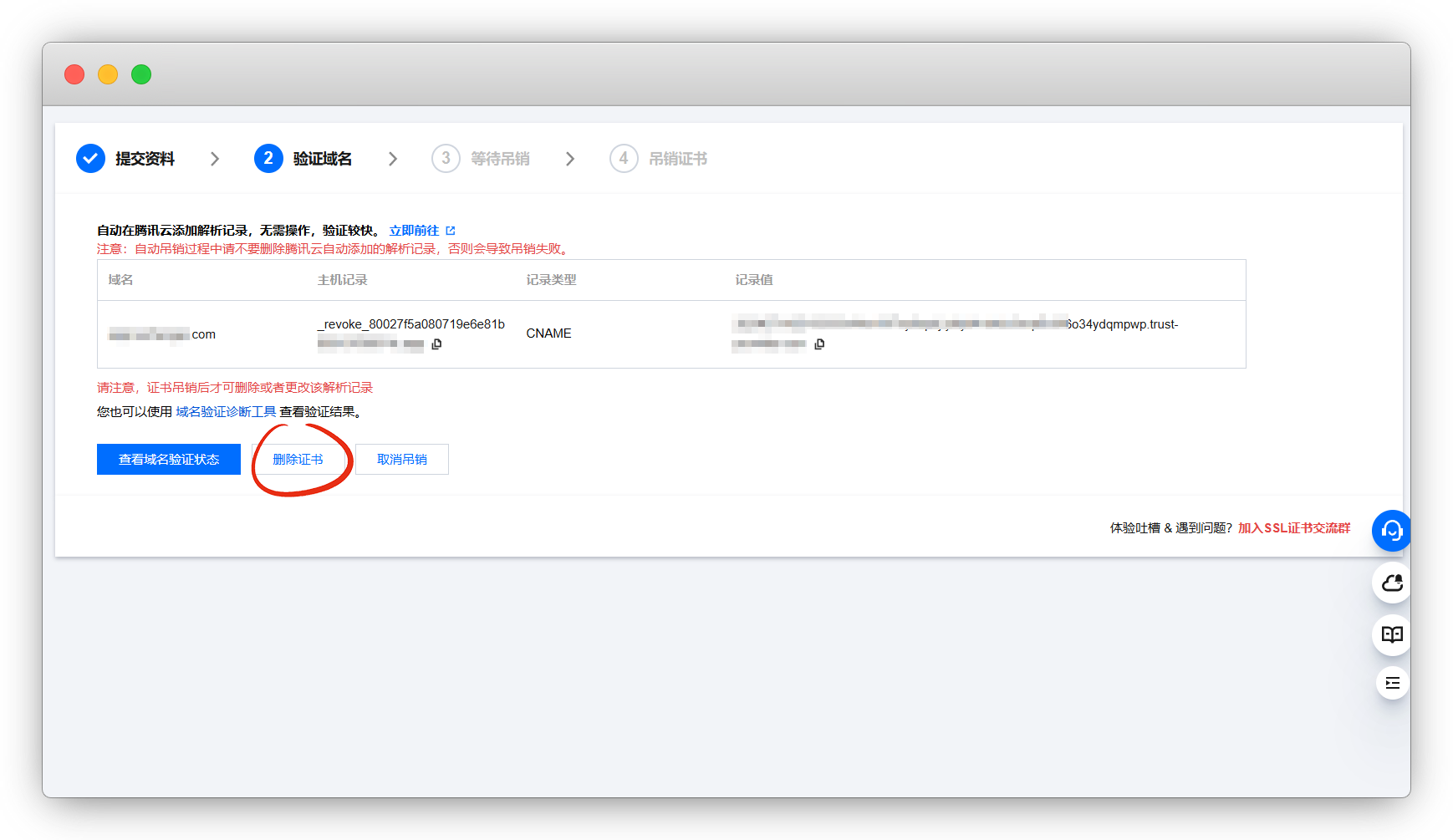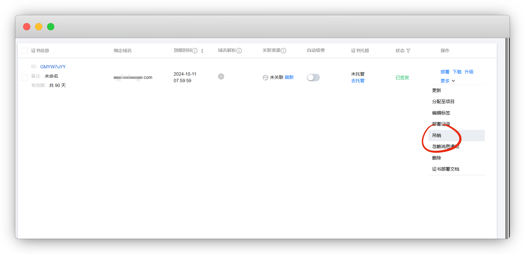 在证书页面,选择要吊销的证书,更多 - 吊销