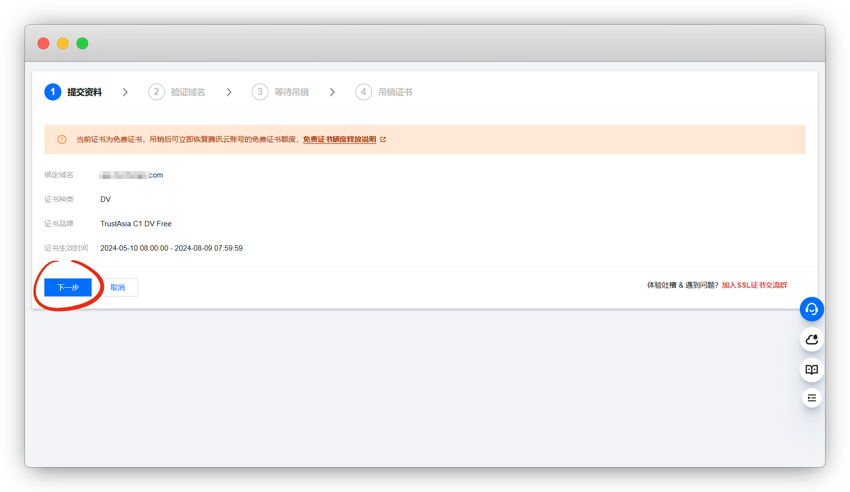 再次点击 申请免费证书